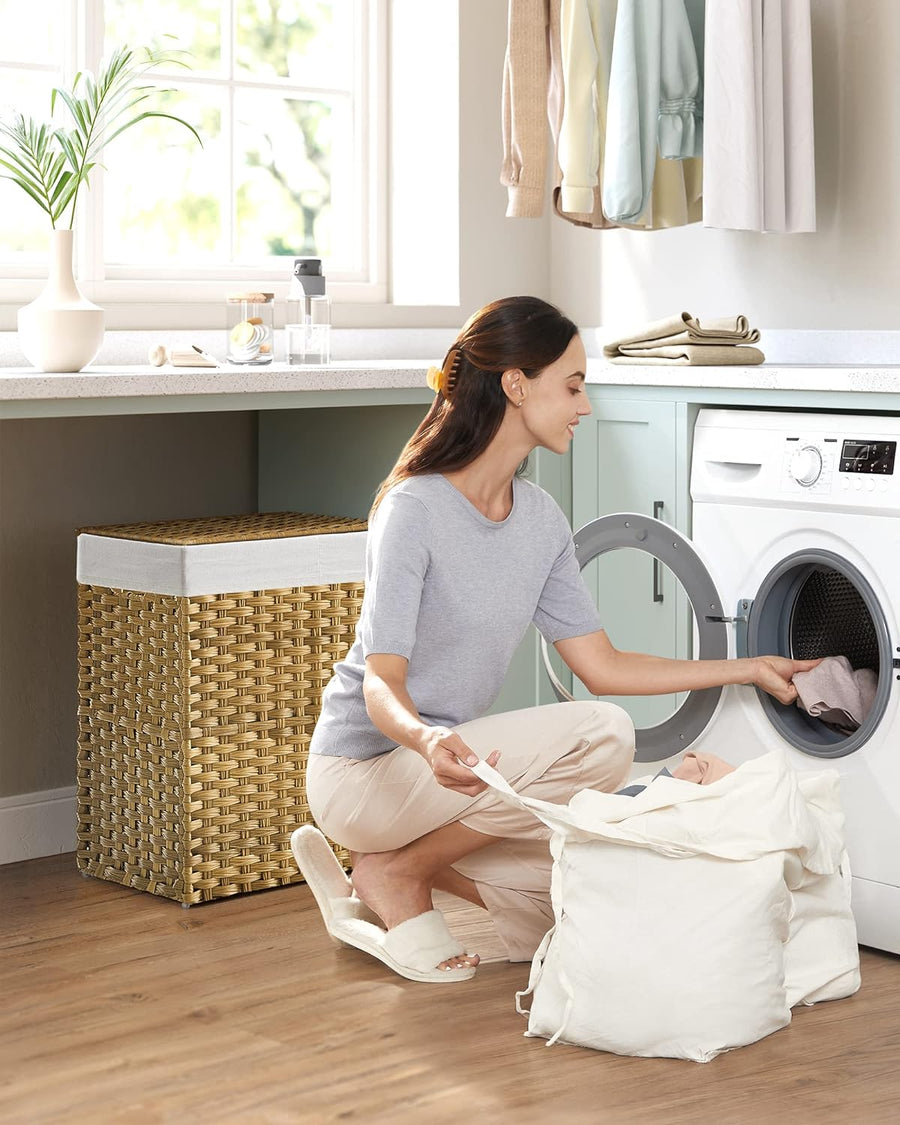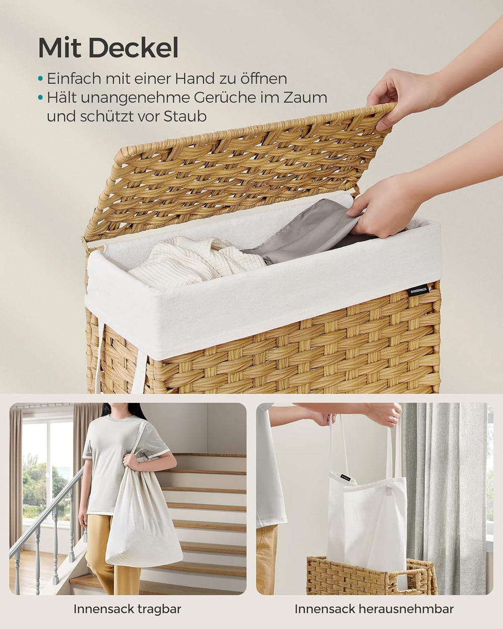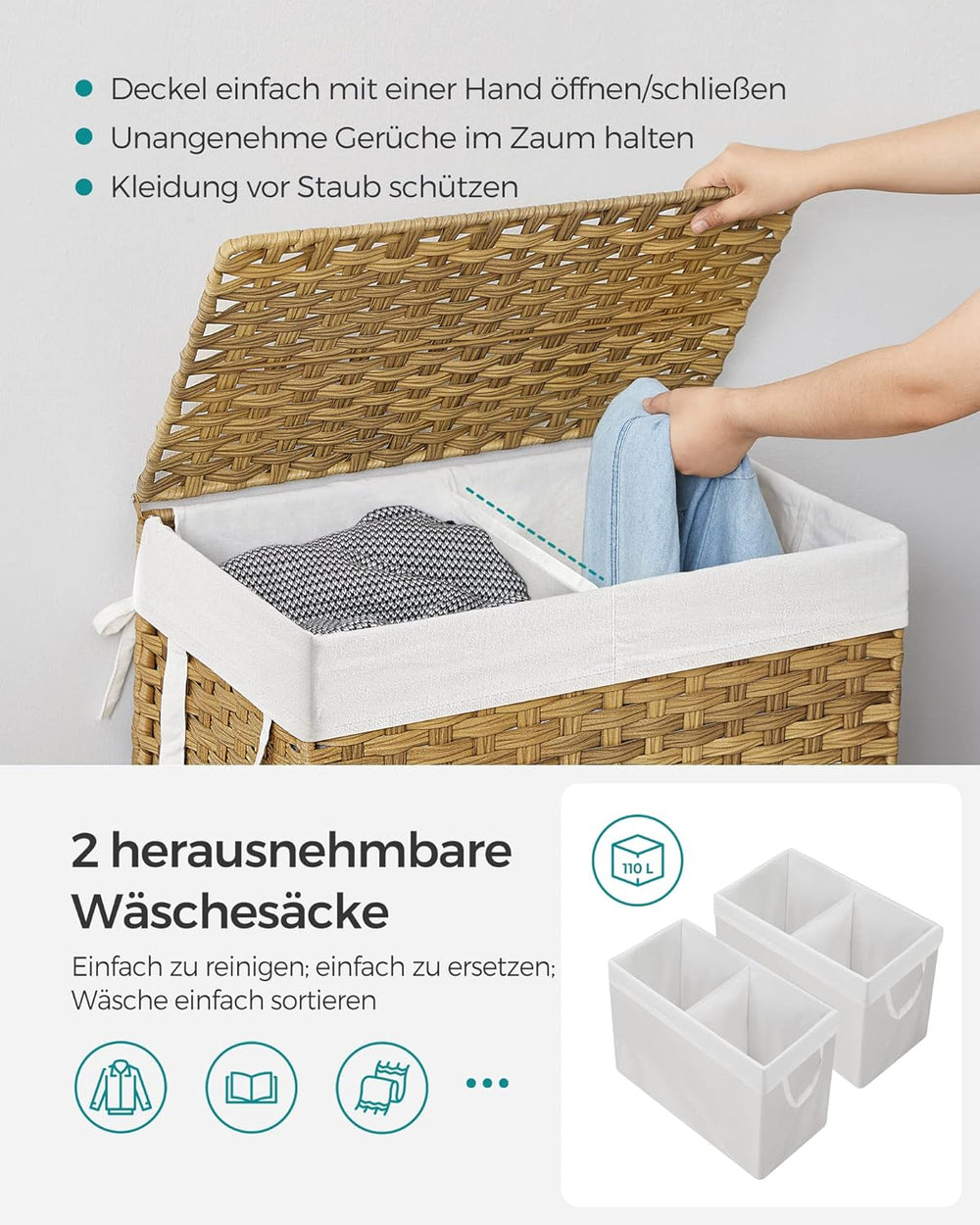 SONGMICS Wäschekorb 2 Fächern, Wäschesammler 160 L, Wäschebox aus synthetischem Rattan, mit Deckel u