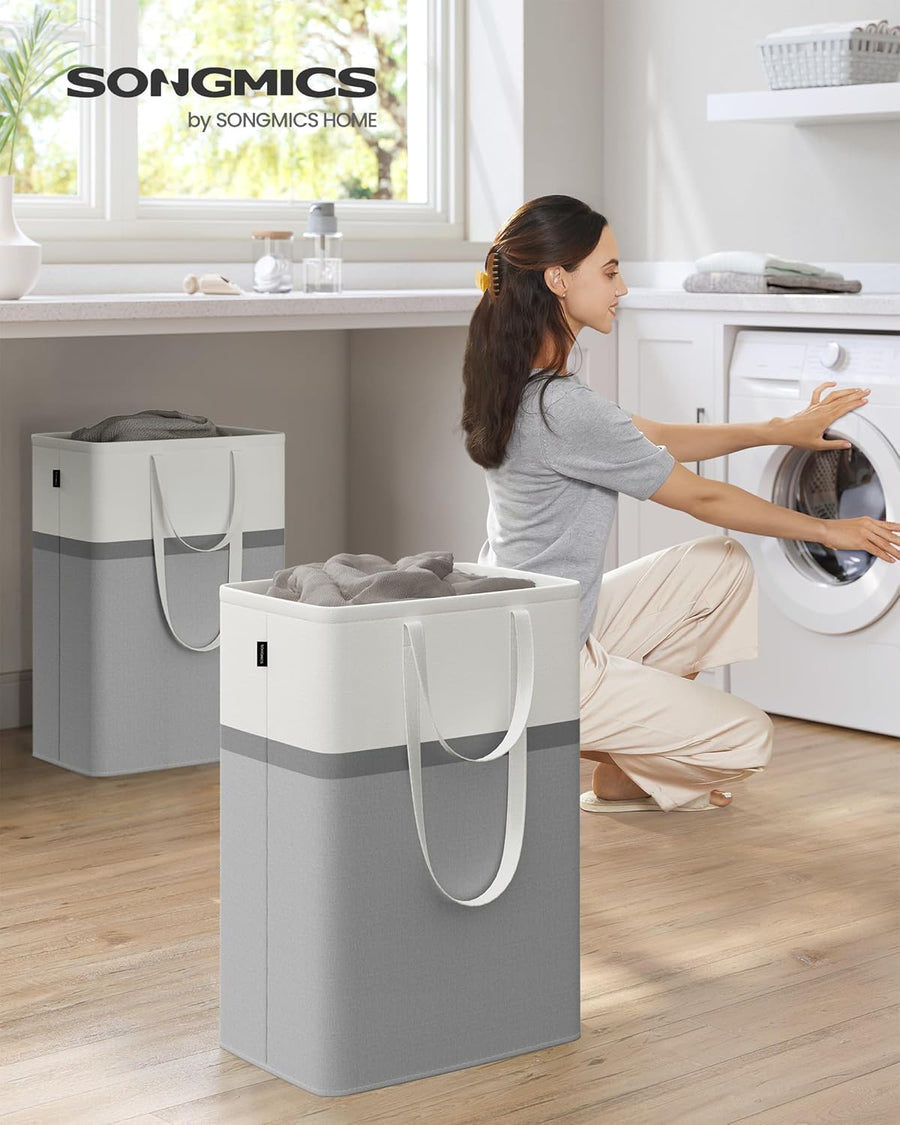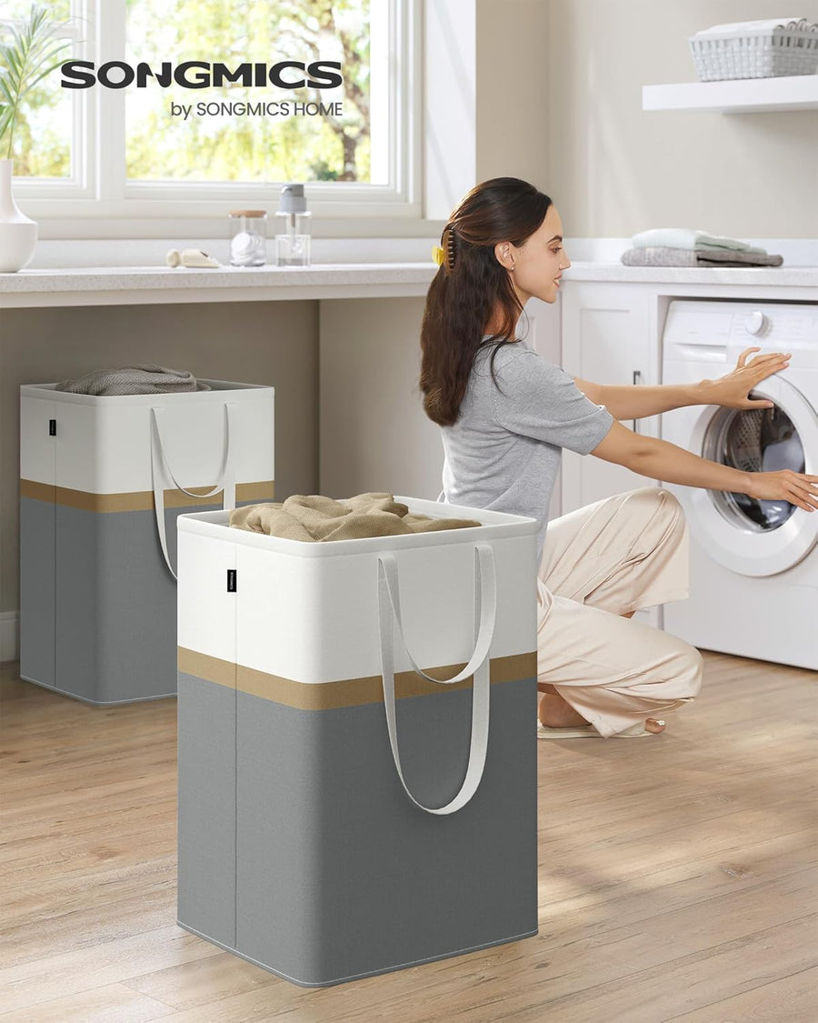 SONGMICS Wäschekorb 2 Fächer, 90 Liter, 2er Set, Wäschesammler gross, Wäschesack, stehend, faltbar,