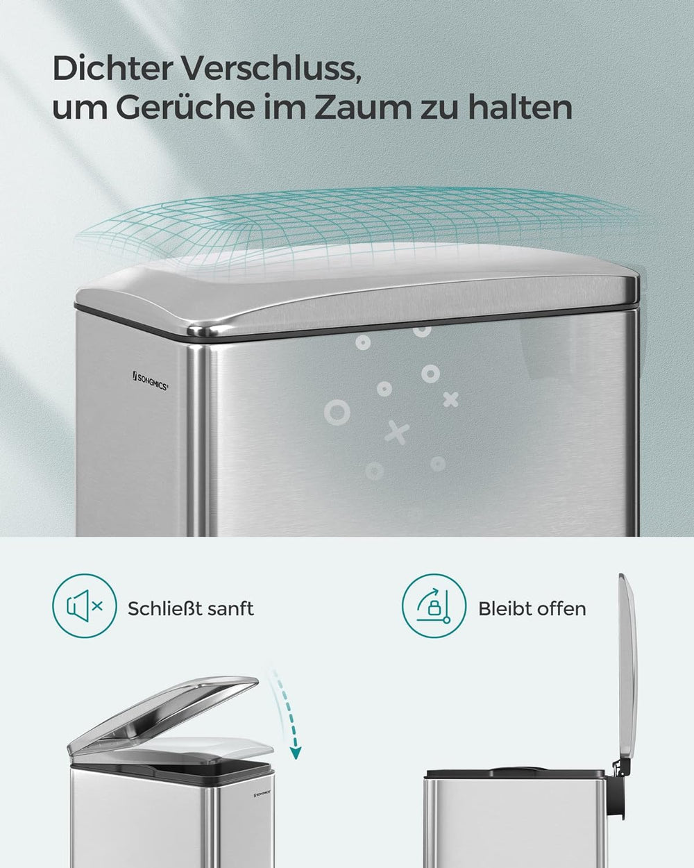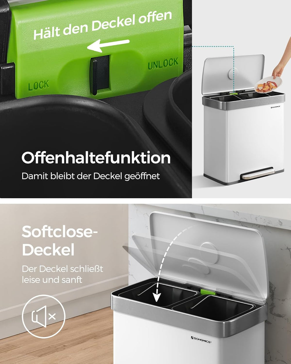 SONGMICS Mülleimer Küche, 40 Liter Abfalleimer mit Deckel, Tretmülleimer, Softclose, Offenhaltefunk