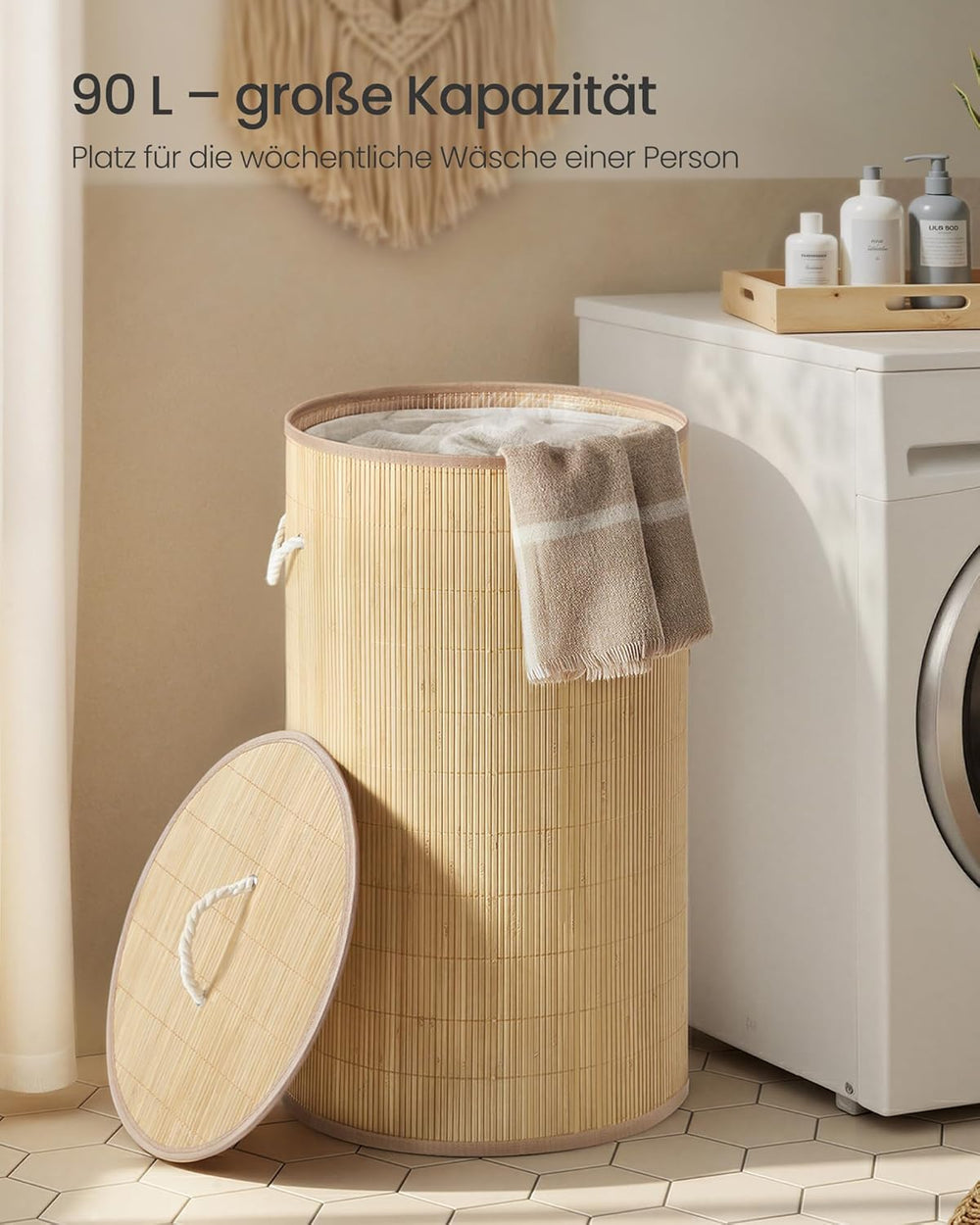 SONGMICS Wäschekorb mit Deckel, 90 L, Wäschesammler Bambus, rund, Wäschebox mit Griffen, faltbar, Wä