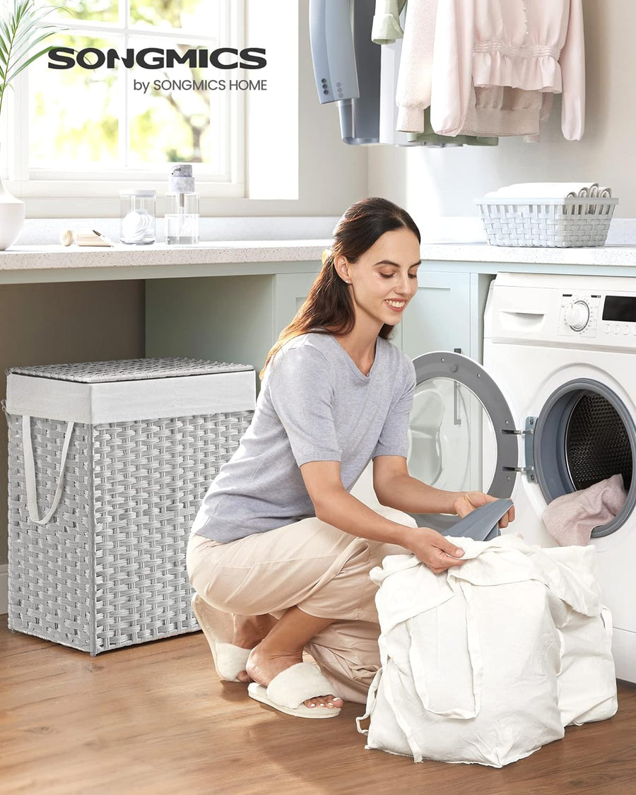 SONGMICS Wäschekorb mit Deckel, Wäschesammler 90 Liter, 2 Fächer, herausnehmbarer Wäschesack mit Gri