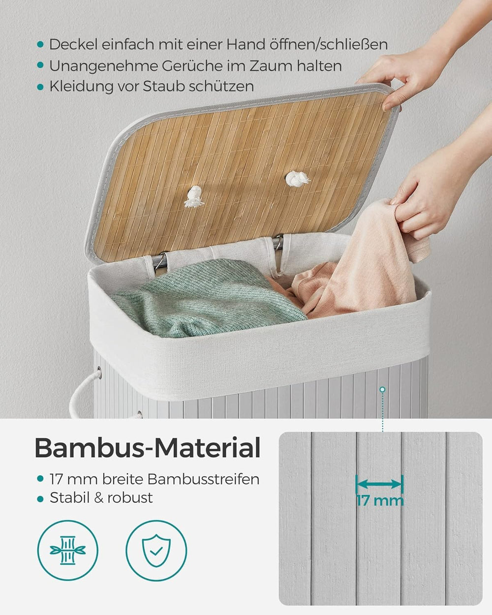 SONGMICS Wäschekorb mit Deckel, Wäschesammler Bambus, Wäschesack herausnehmbar und maschinenwaschbar