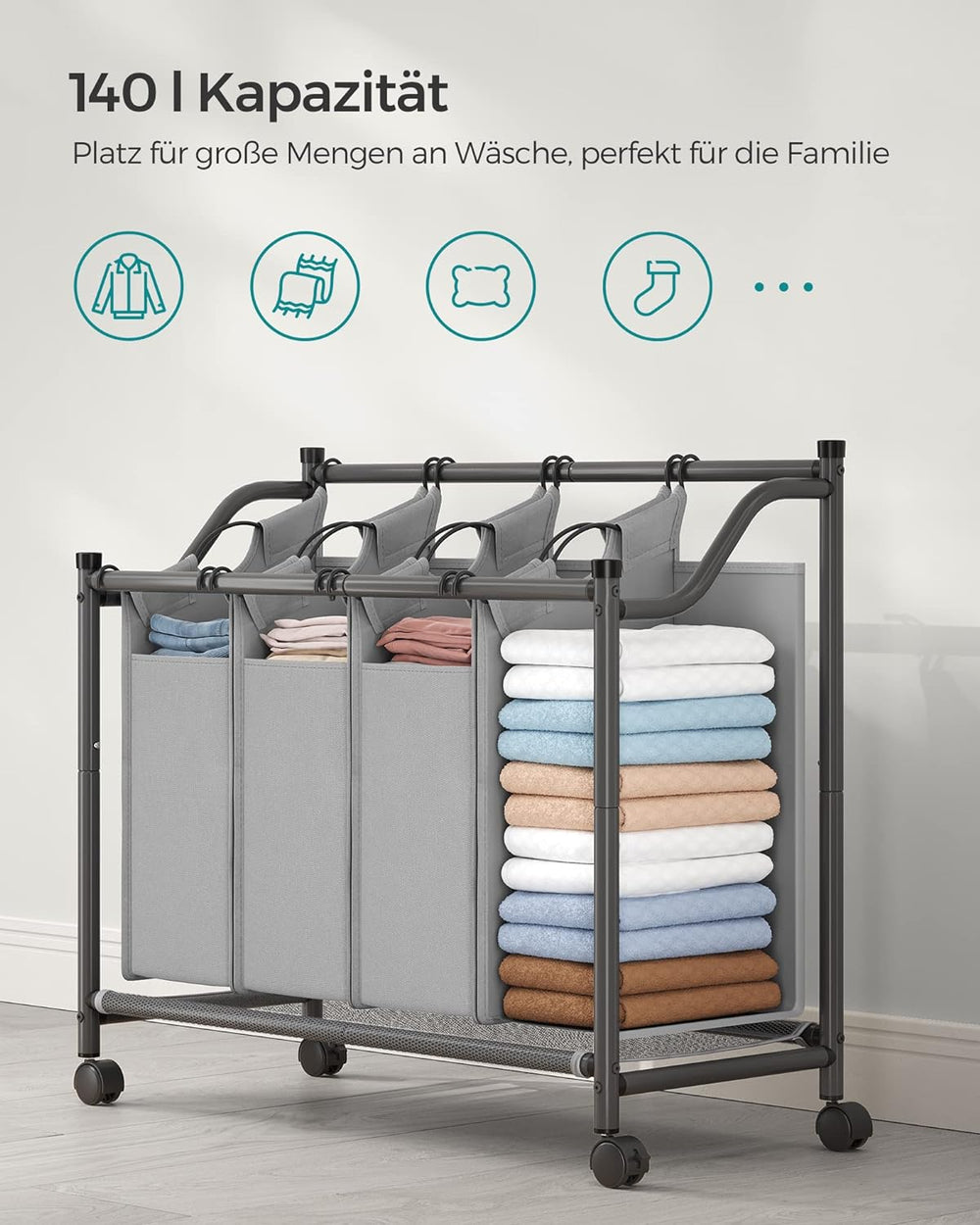 SONGMICS Wäschekorb, Wäschesammler, Wäschesortierer mit 4 abnehmbaren Stofftaschen, Rollen, Aufbewah