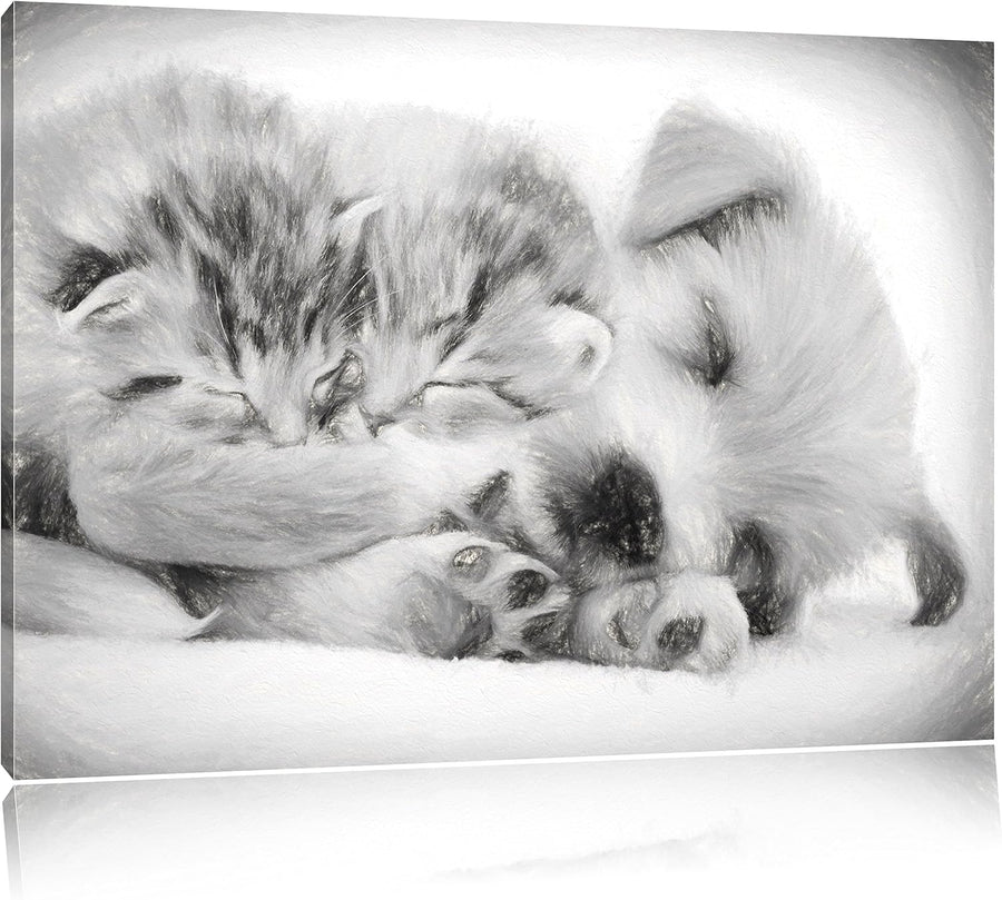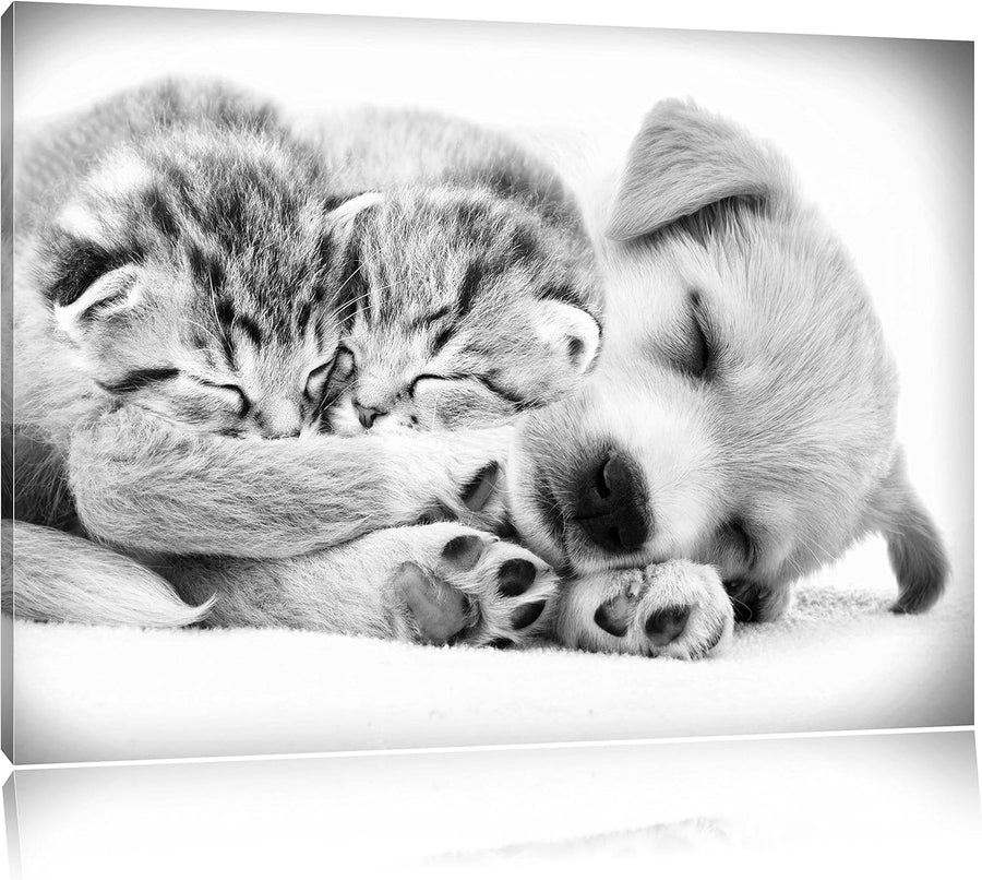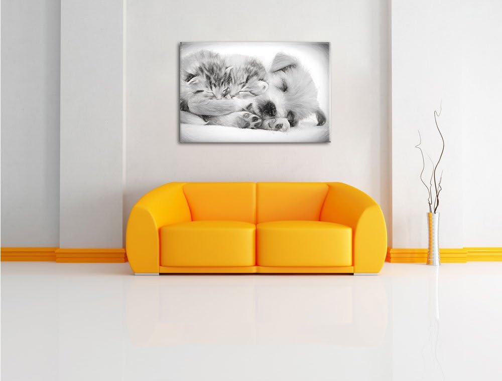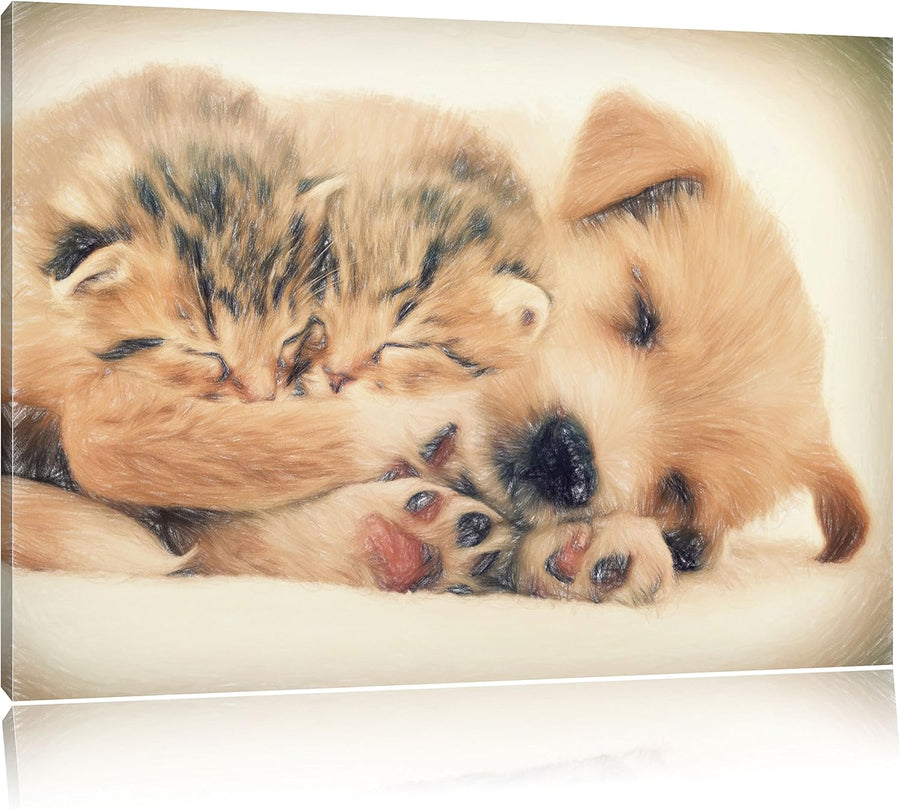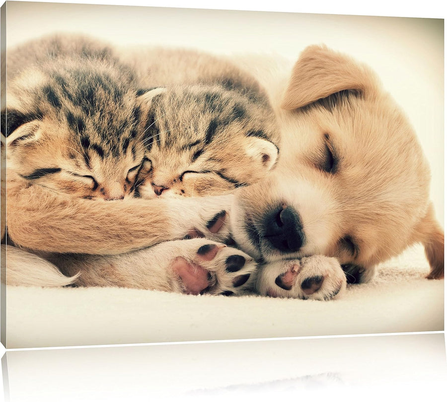 Pixxprint Hundewelpe mit kleinen Kätzchen als Leinwandbild/Grösse: 100x70 / Wandbild/Kunstdruck/fert