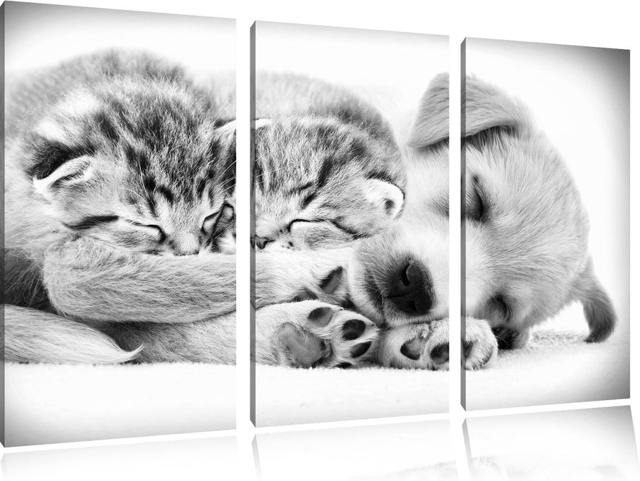 Pixxprint Hundewelpe mit kleinen Kätzchen als Leinwandbild/Grösse: 3 Teilig (120x80) cm/Wandbild/Kun