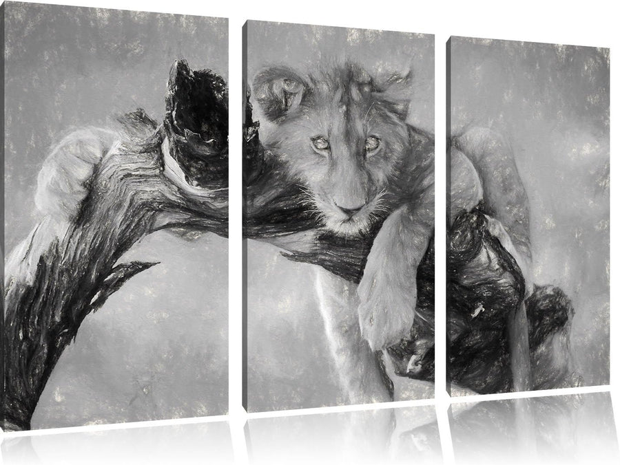 Pixxprint Junger Löwe in der Natur Kunst Kohle Effekt 3-Teiler Leinwandbild 120x80 Bild auf Leinwand