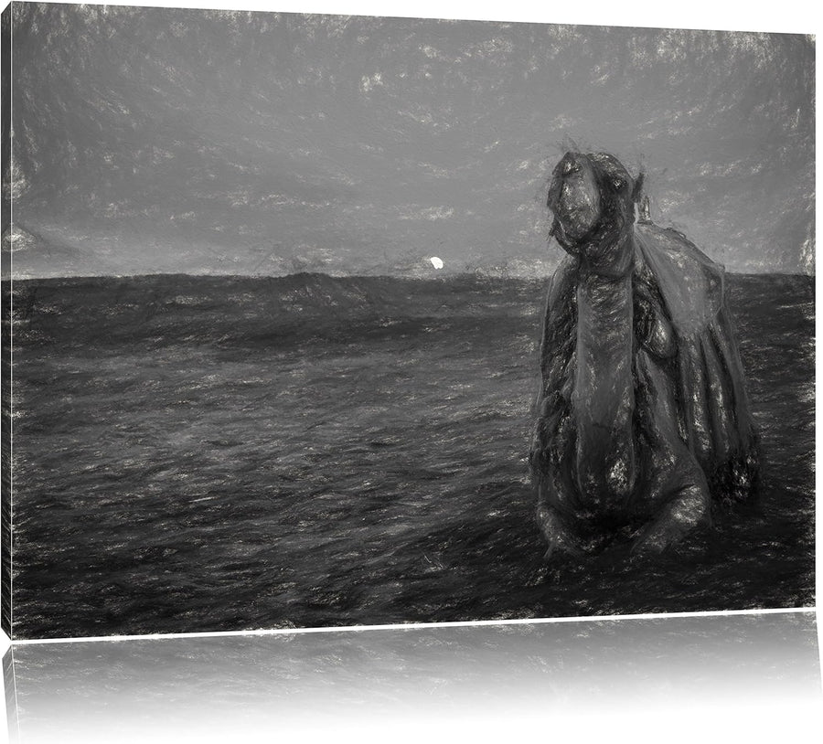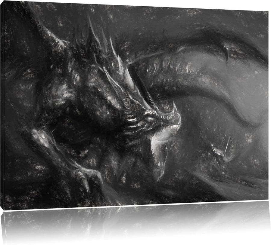 Pixxprint Kampf zwischen Mensch und Drache Kohle Zeichnung Effekt, Format: 100x70 auf Leinwand, 100x