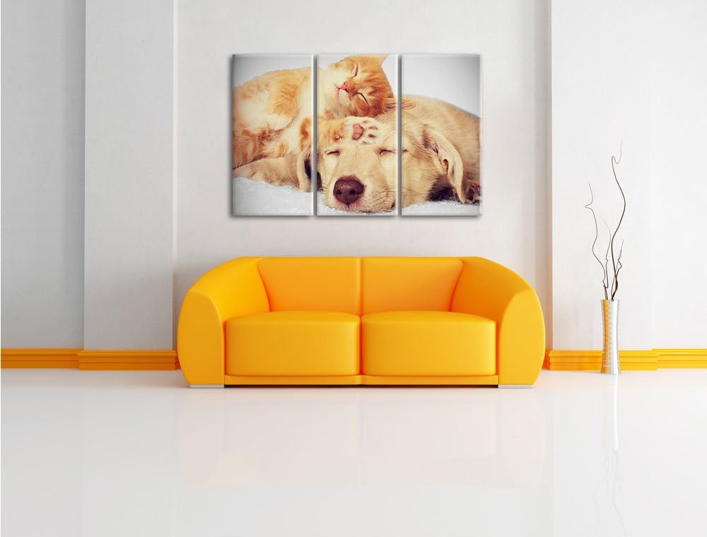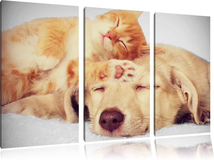 Pixxprint Kätzchen und Welpe schlafen B&W Detail 3-Teiler Leinwandbild 120x80 Bild auf Leinwand