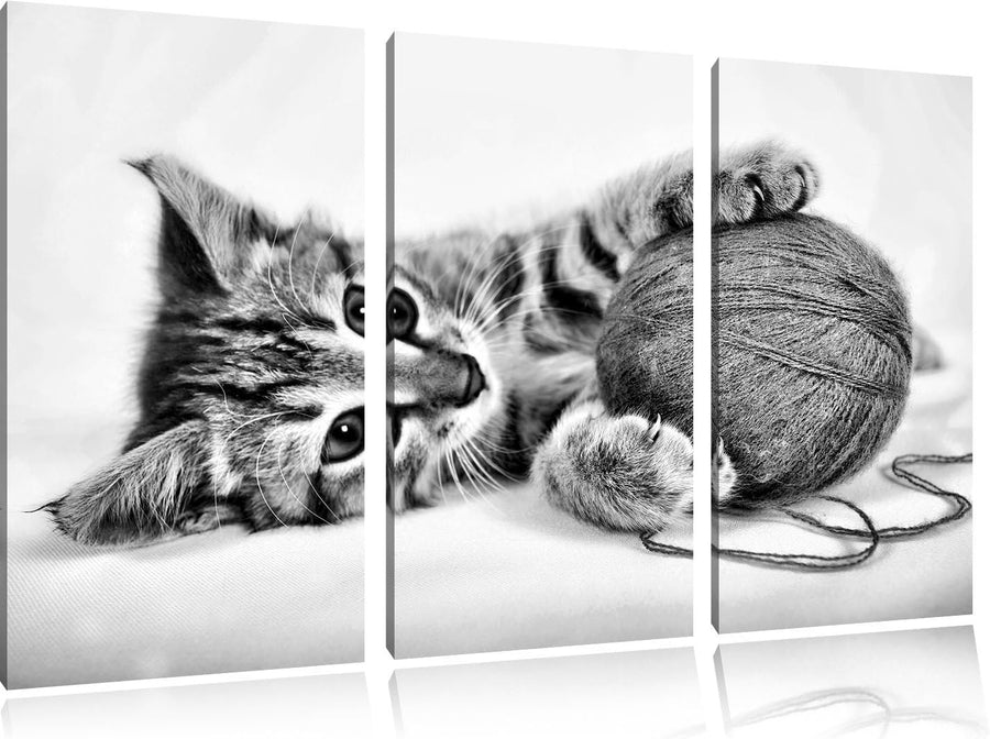 Pixxprint Kätzchen mit Wollknäuel als Leinwandbild/Grösse: 3 Teilig (120x80) cm/Wandbild/Kunstdruck/