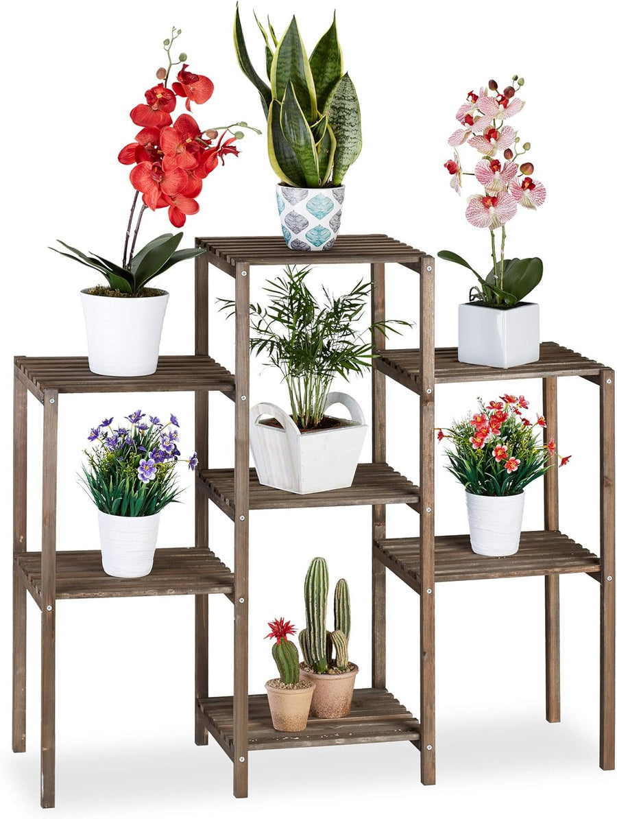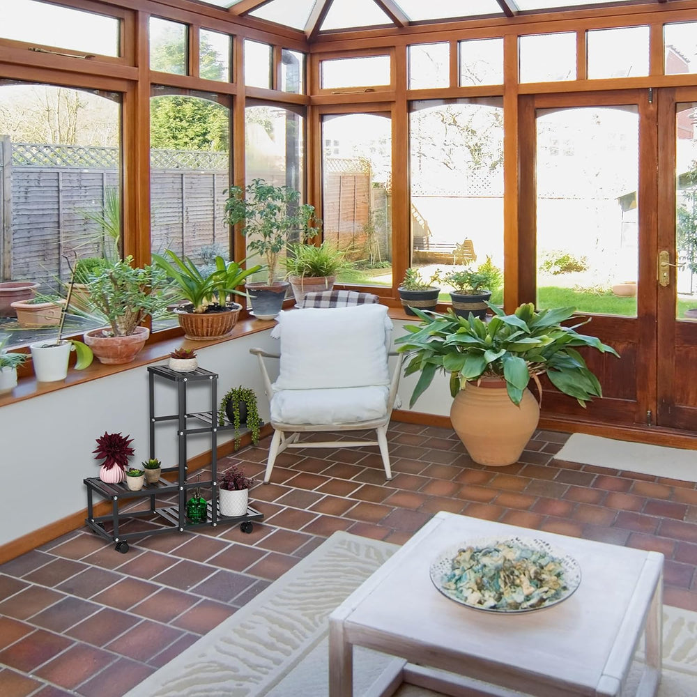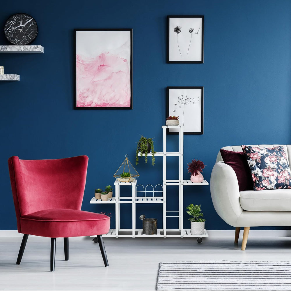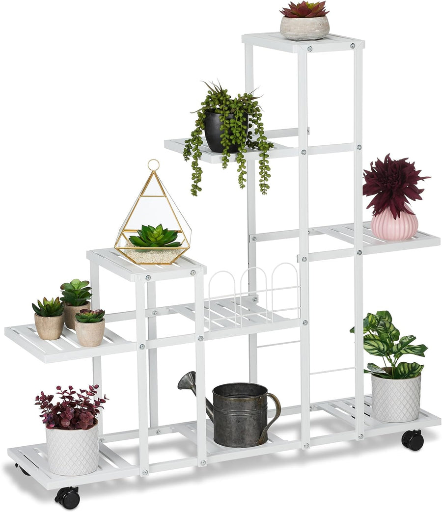 Relaxdays Blumenständer mit Rollen, H x B x T: 91,5 x 93 x 26 cm, Metall, 9 Ablagen, Pflanzenständer