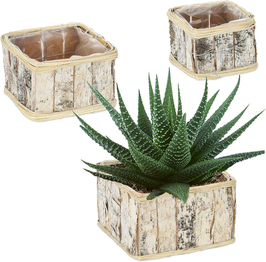 Relaxdays Blumentopf, 3 Grössen, rechteckig, Birke, Pflanzentöpfe mit Folie, Pflanzkörbe für innen u