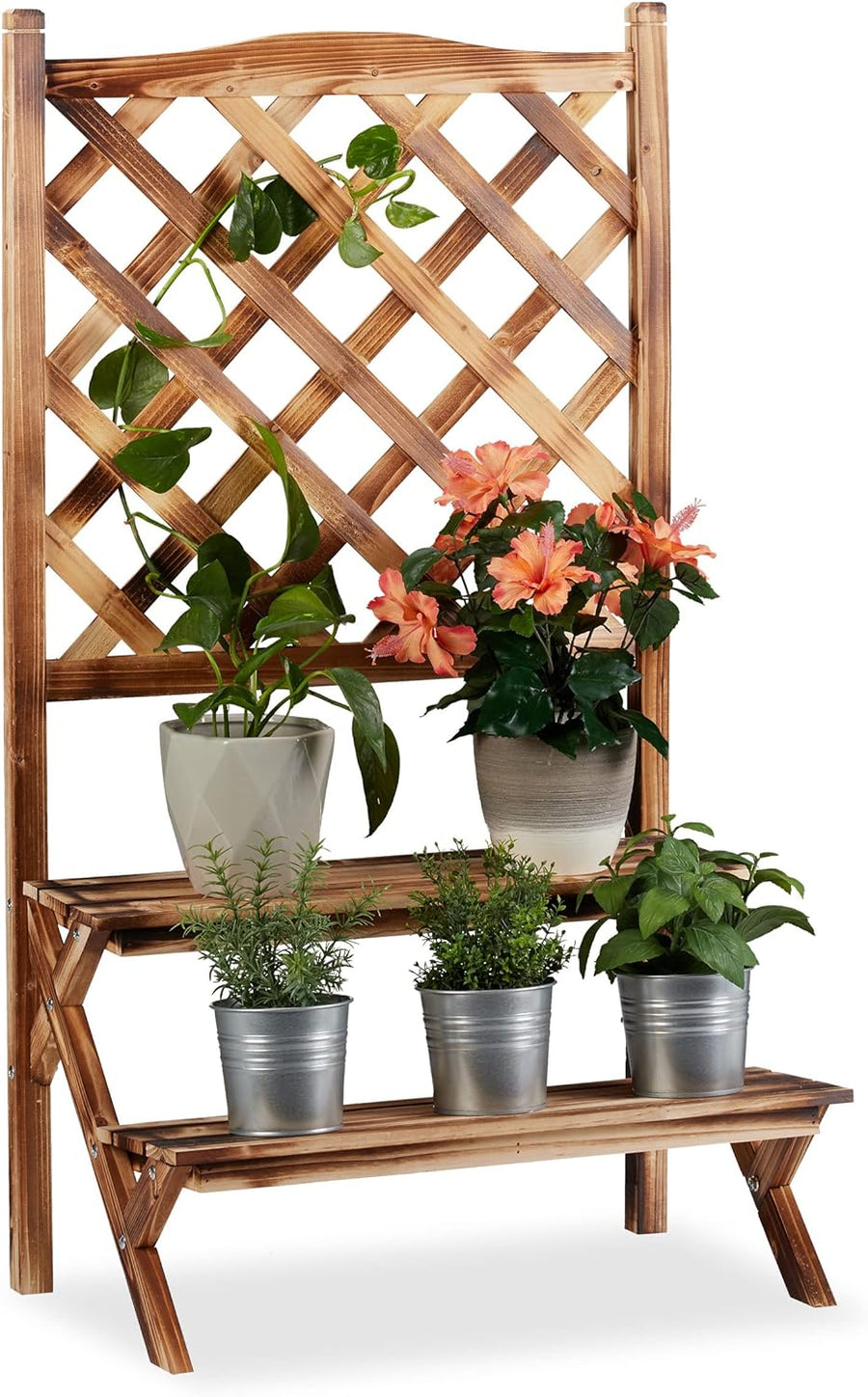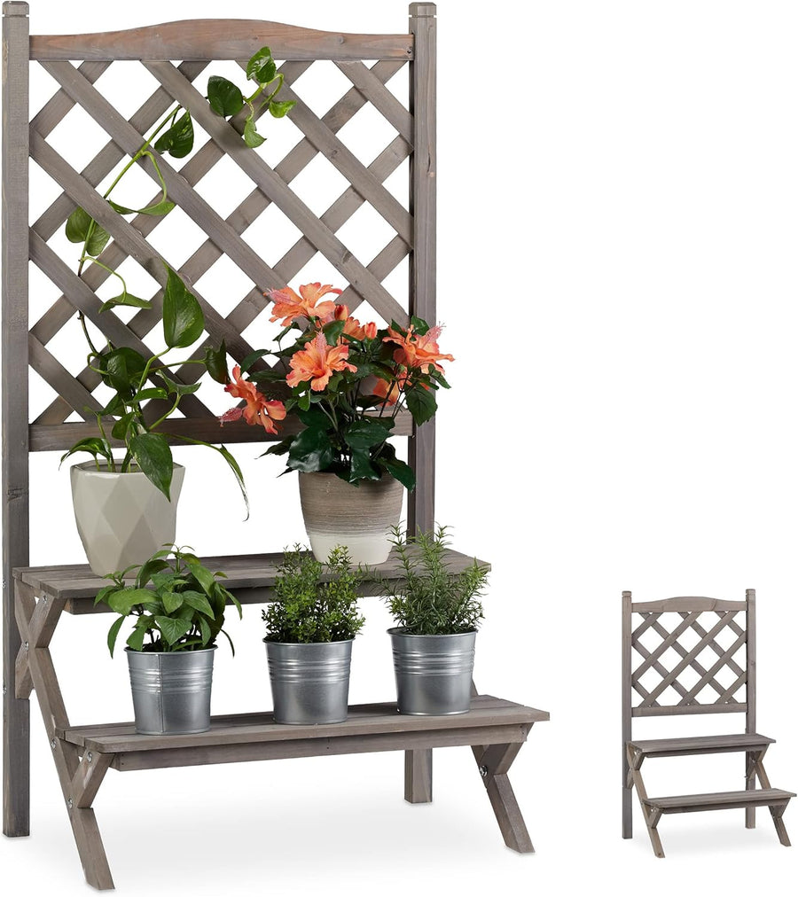 Relaxdays Blumentreppe mit Rankgitter, Blumenregal 2 Ebenen, stehende Pflanzentreppe Holz, HBT: 109x