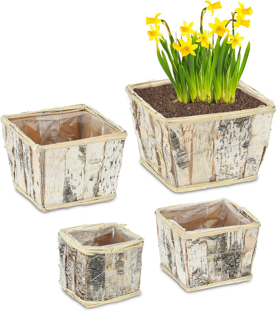 Relaxdays Blumentopf, 4 versch. Grössen, eckig, Birke, Pflanzentöpfe mit Folie, Pflanzkörbe für inne