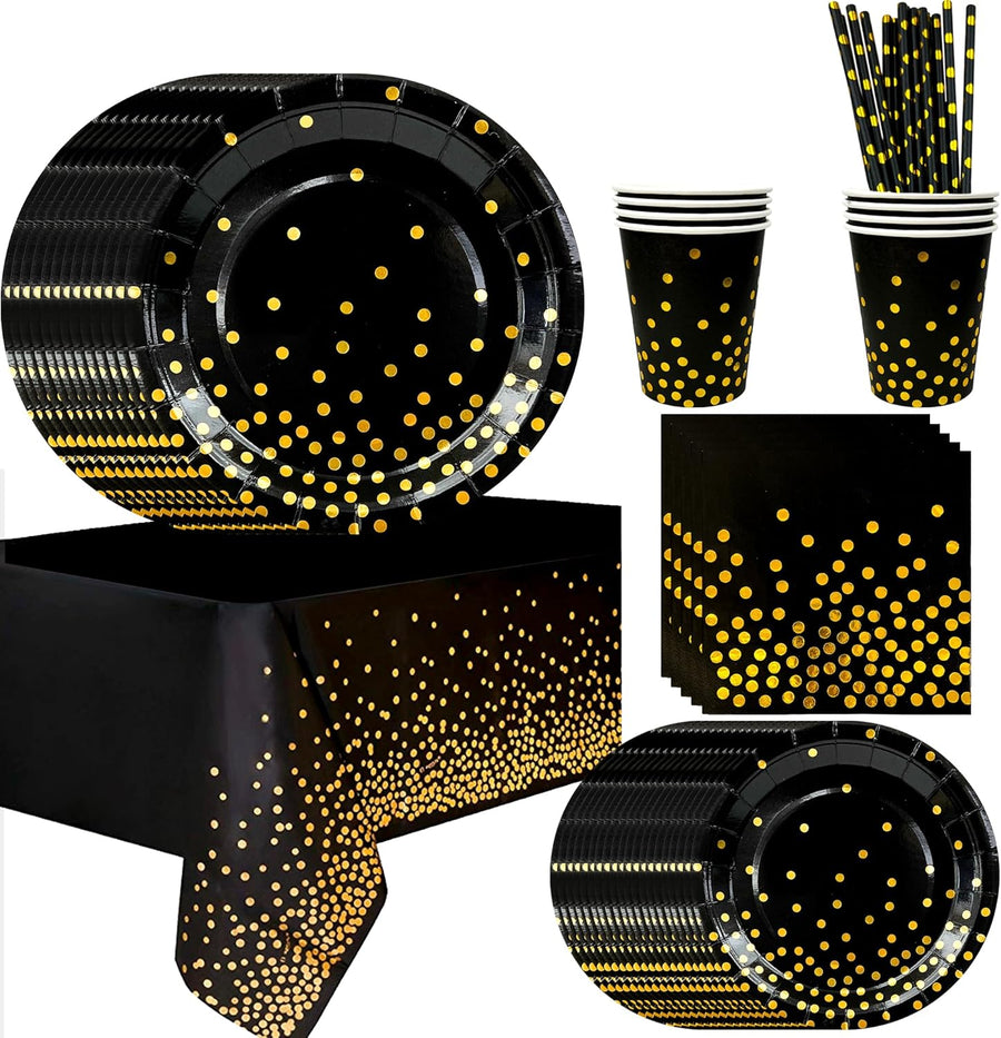 Party Geschirr Schwarz Gold,193pcs Schwarzgoldenes Geburtstag Party Geschirr Set-Pappteller Schwarz