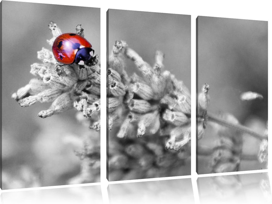 Pixxprint Kleiner Marienkäfer auf Lavendel Kunst B&W 3-Teiler Leinwandbild 120x80 Bild auf Leinwand