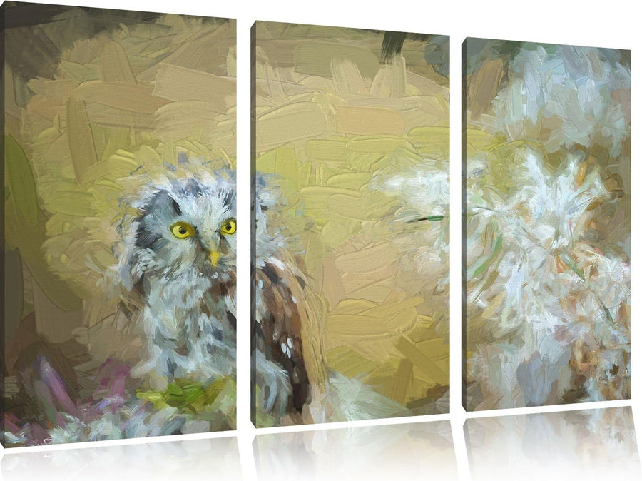 Pixxprint Kleiner Kauz auf AST / 3-Teilig/Gesamtmass 120cm Leinwandbild bespannt auf Holzrahmen/Wand
