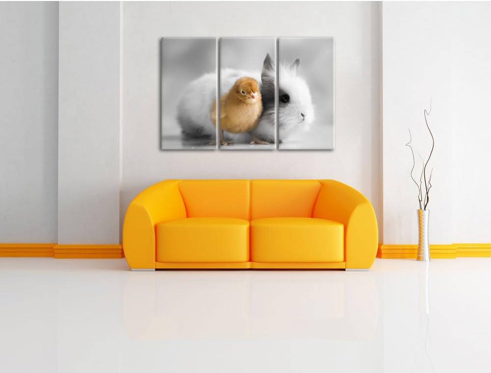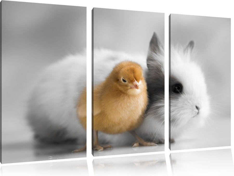 Pixxprint kleines Küken mit süssem Häschen B&W Detail 3-Teiler Leinwandbild 120x80 Bild auf Leinwand