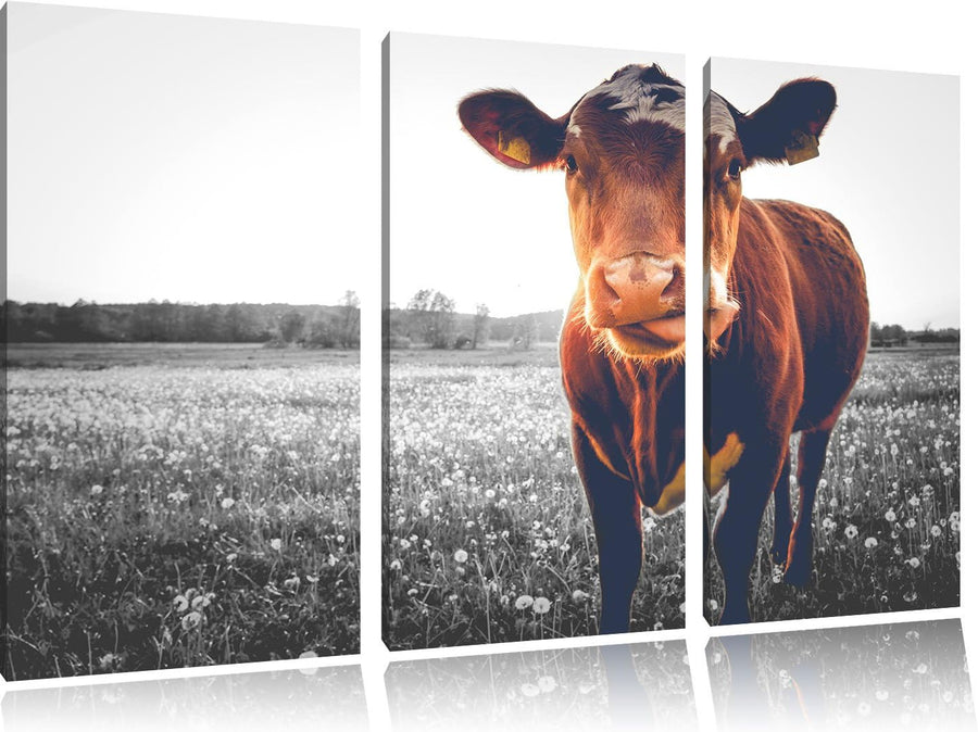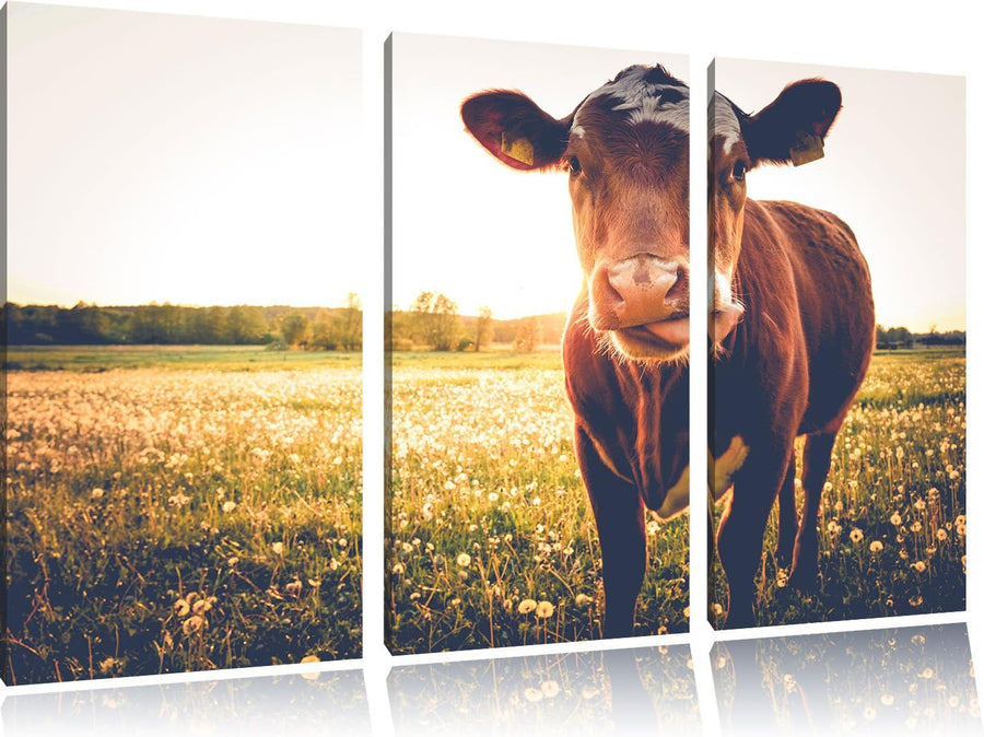 Pixxprint Kuh auf Butterblumenwiese als Leinwandbild/Grösse: 3 Teilig (120x80 cm) cm/Wandbild/Kunstd