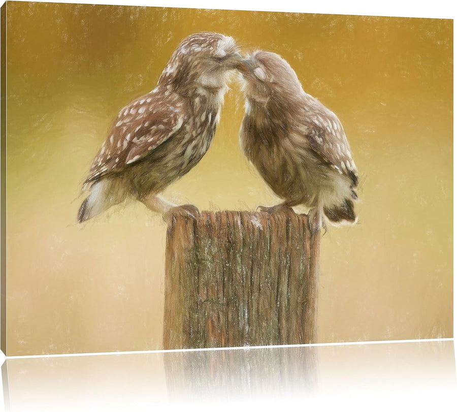 Pixxprint Küssende Eulen / 100x70cm Leinwandbild bespannt auf Holzrahmen/Wandbild Kunstdruck Dekorat