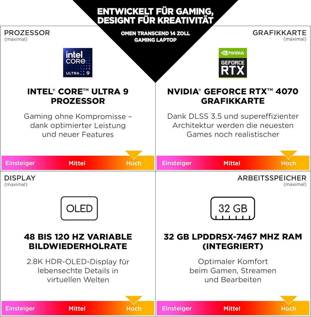 HP OMEN Transcend Gaming Laptop, 14 Zoll 2,8K OLED 120Hz, Intel Core Ultra 9 185H, 32 GB DDR5 RAM, 1