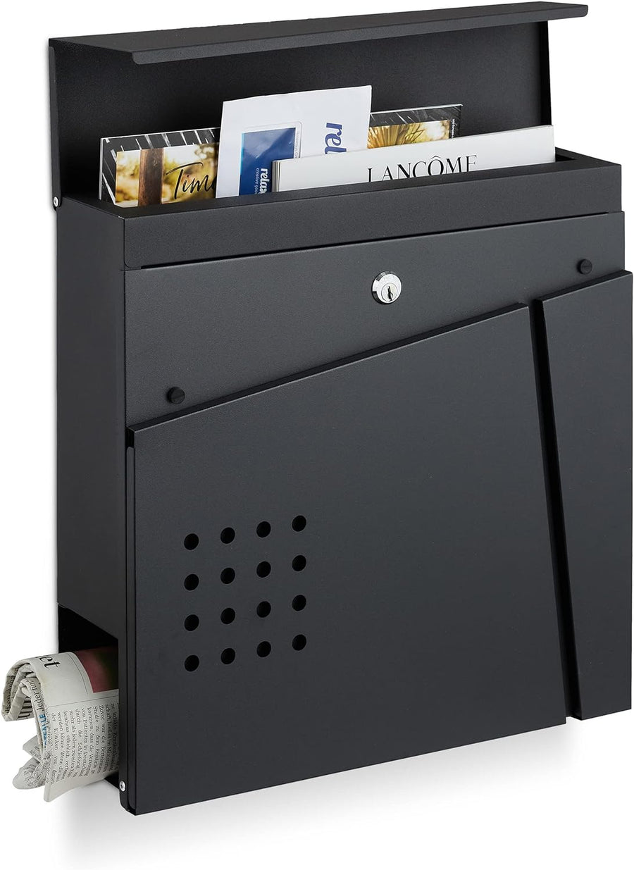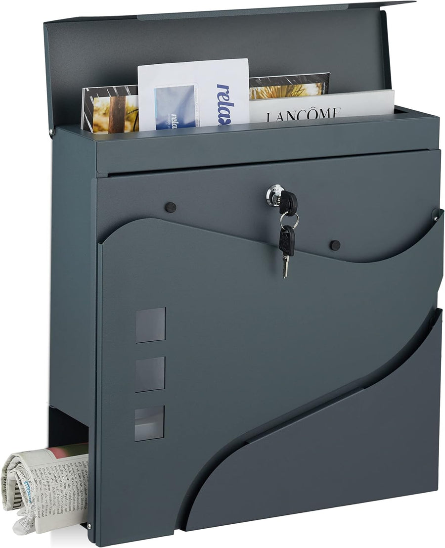 Relaxdays Briefkasten mit Zeitungfach, HBT: 30 x 36 x 10 cm, Metall, mit 2 Schlüsseln, moderner Post