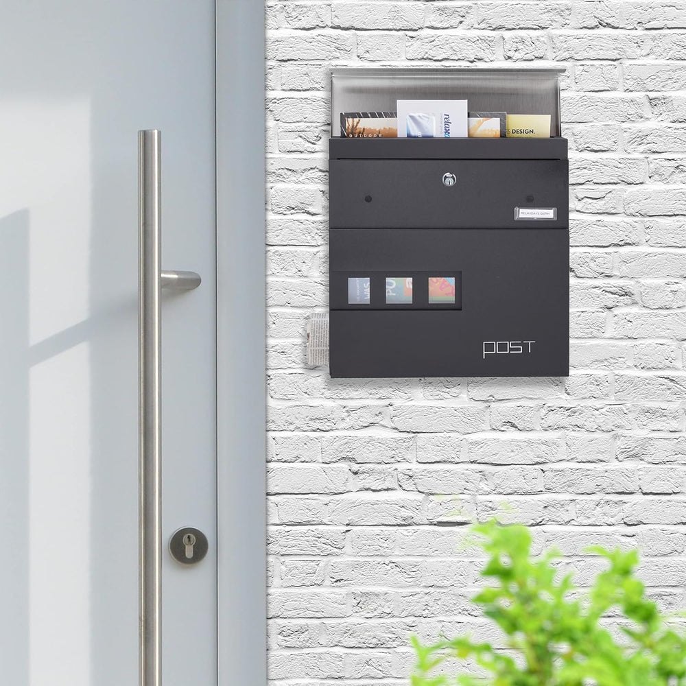 Relaxdays Briefkasten mit Zeitungsfach, Wand-Postkasten mit Sichtfenster, HBT 37x37x11cm, Stahl, 2 S