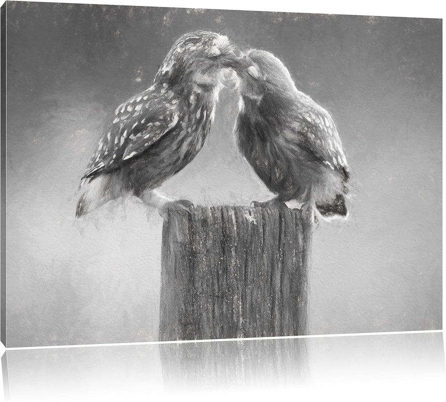 Pixxprint Küssende Eulen Kunst Kohle Effekt, Format: 100x70 auf Leinwand, riesige Bilder fertig gera