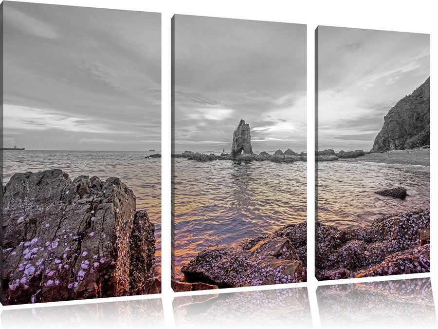 Pixxprint Küstenlinie mit schönen Sonnenuntergang B&W Detail 3-Teiler Leinwandbild 120x80 Bild auf L