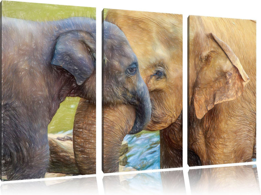 Pixxprint liebevolle Elefantenmutter mit Kalb Kunst Buntstift Effekt 3-Teiler Leinwandbild 120x80 Bi