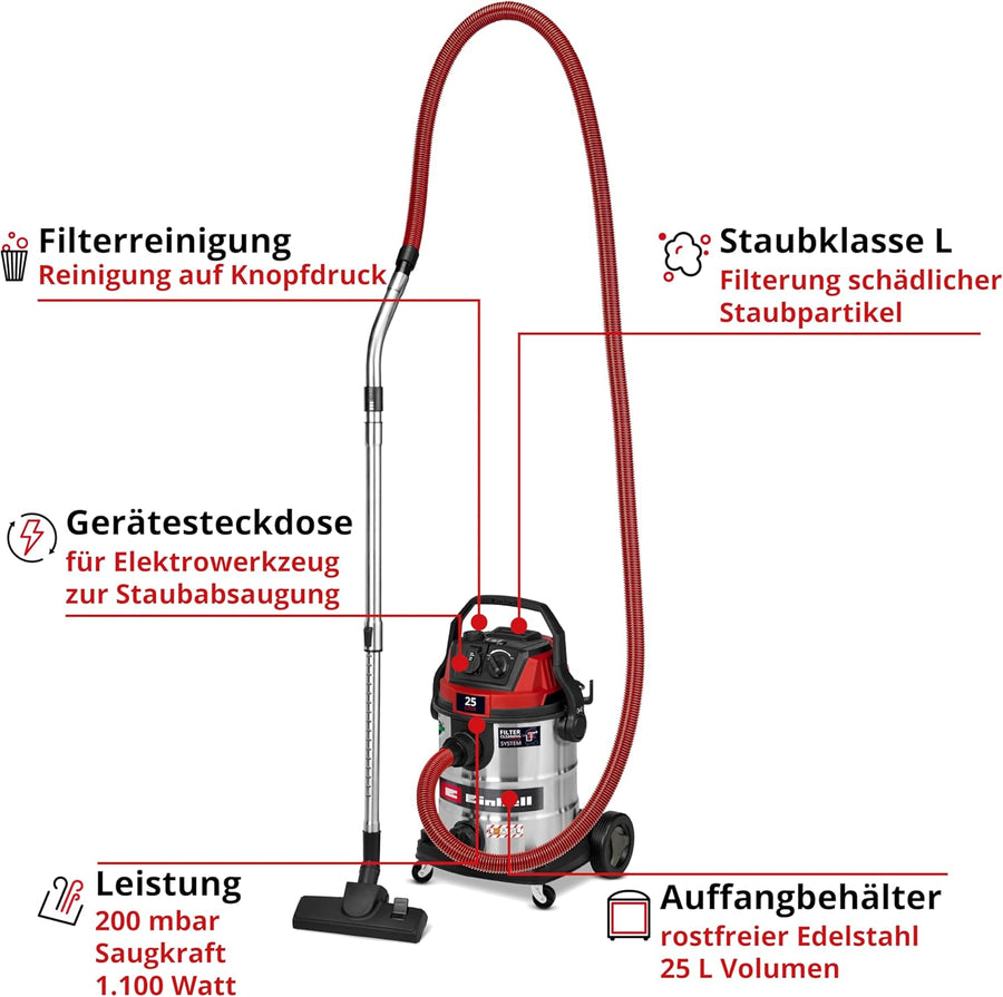 Einhell TE-VC 2580 SACL Wet/Dry Vacuum Cleaner (1100 W, 200 mbar Suction Power, 25 L Container, Dust