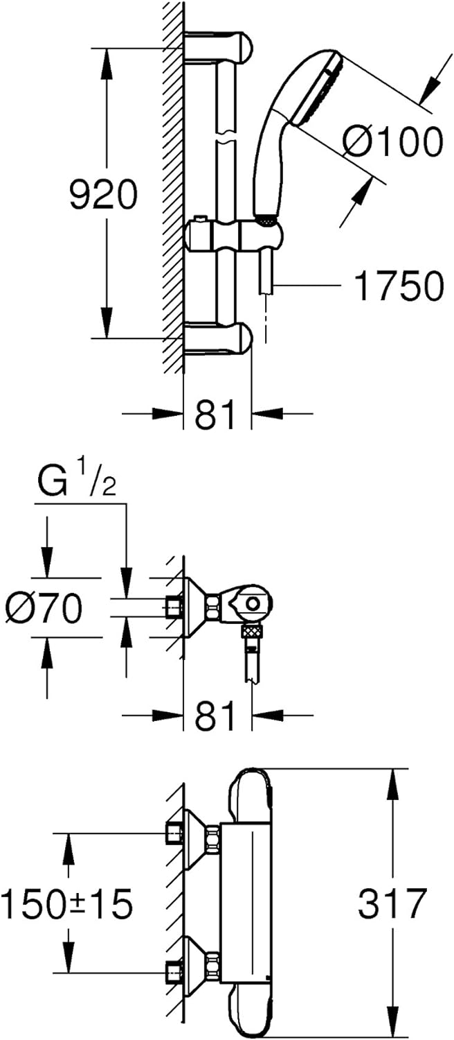 GROHE Grohtherm 1000 Thermostat-Brausebatterie (DN 15, mit Brausegarnitur) chrom, 34256004, 900 mm (