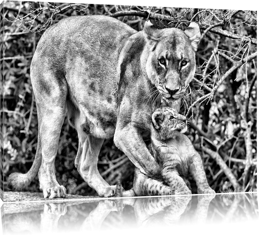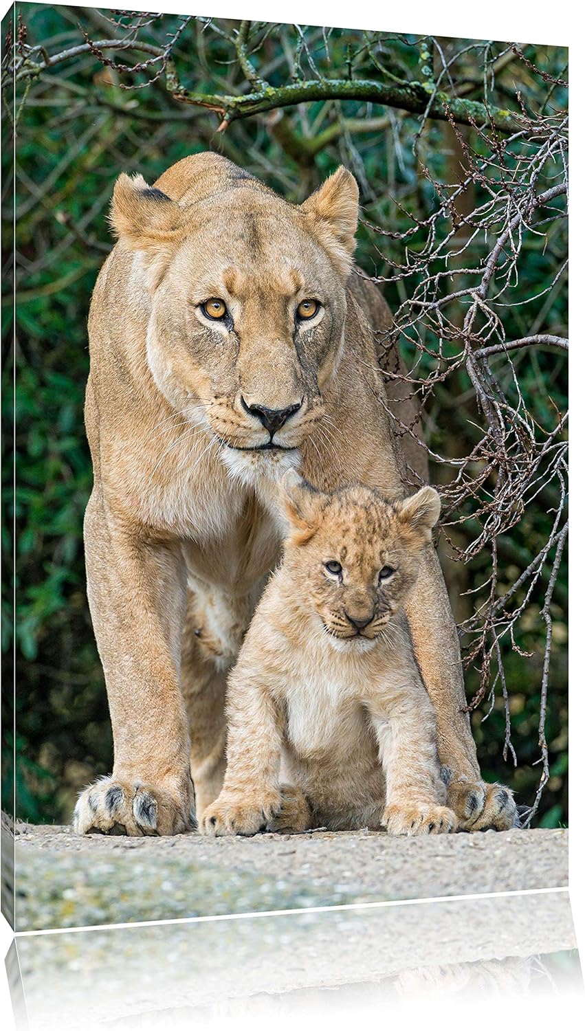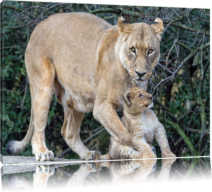 Pixxprint Löwin mit Jungtier auf Leinwand, XXL riesige Bilder fertig gerahmt mit Keilrahmen, Kunstdr