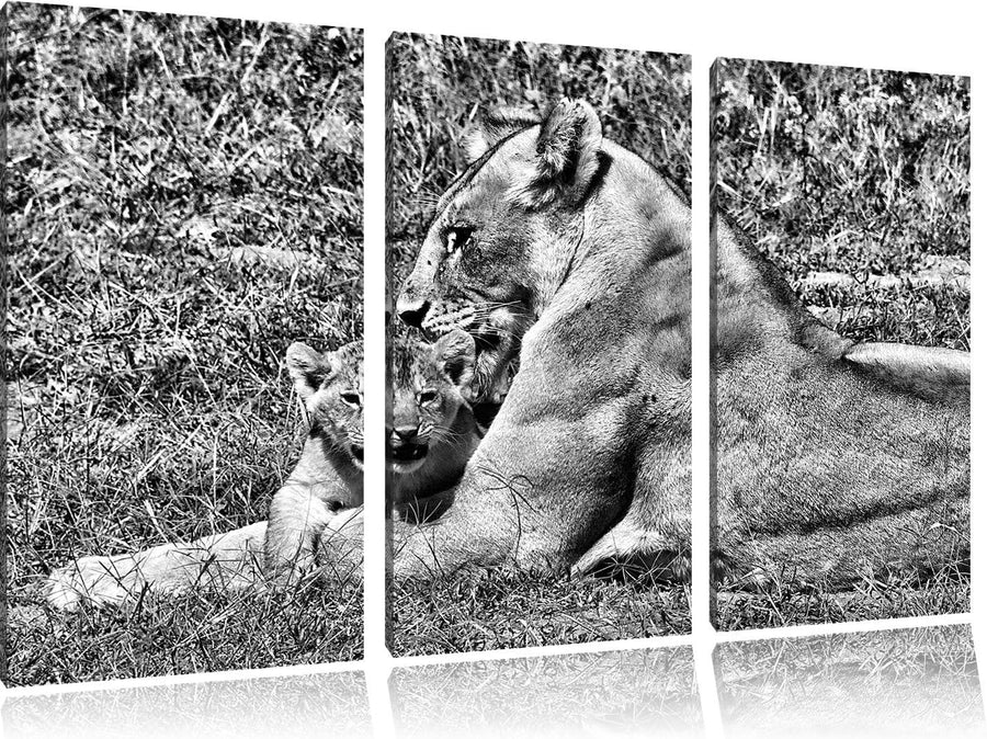 Pixxprint Löwin putzt Ihr Junges / 3-Teilig/Gesamtmass 120cm Leinwandbild bespannt auf Holzrahmen/Wa