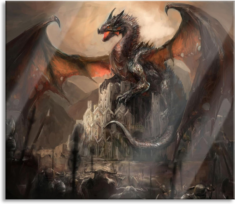 Drache schützend über Burg Herdabdeckplatte & Spritzschutz aus Echtglas | Für Herd-Kochfelder | 60x5