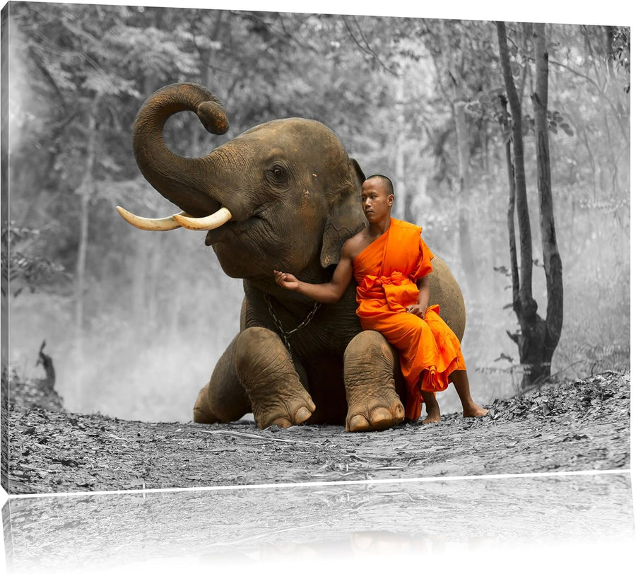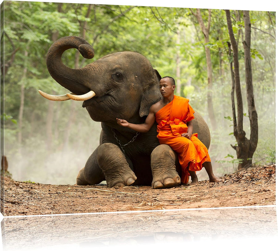 Pixxprint Mönch mit Elefanten im Wald als Leinwandbild | Grösse: 100x70 cm | Wandbild | Kunstdruck |