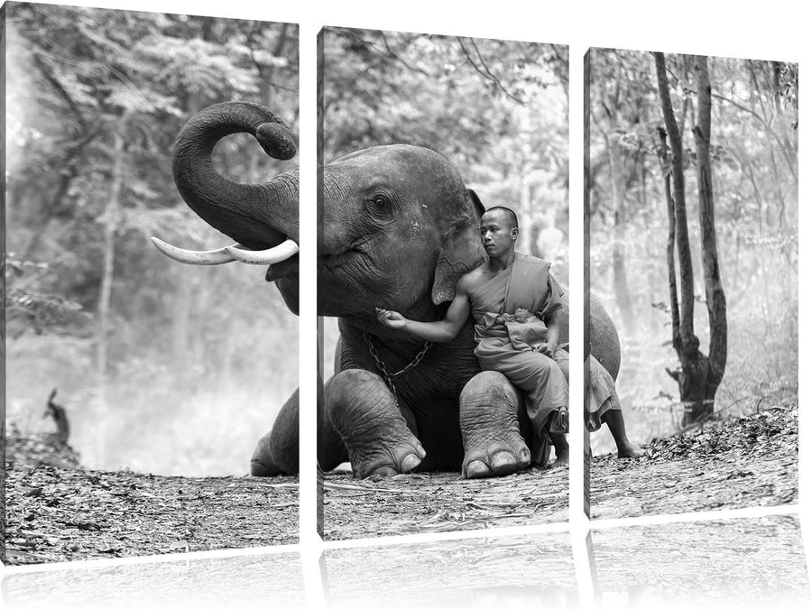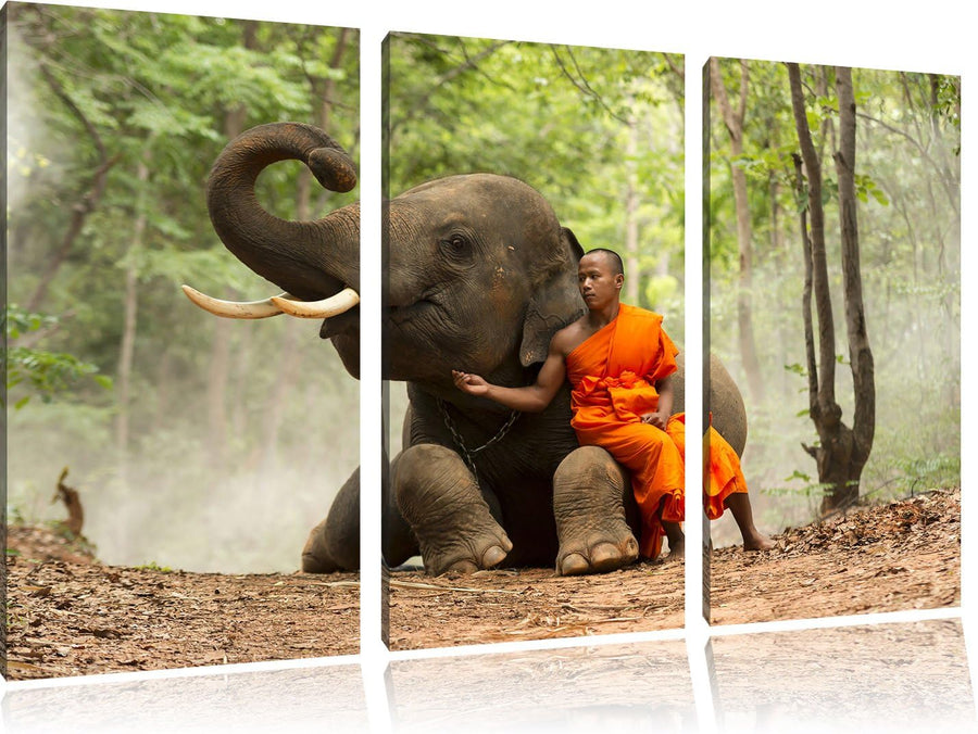 Pixxprint Mönch mit Elefanten im Wald / 3-Teilig/Gesamtmass 120cm Leinwandbild bespannt auf Holzrahm