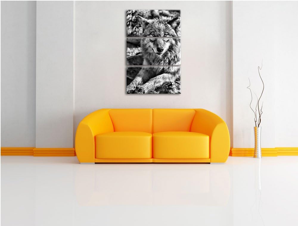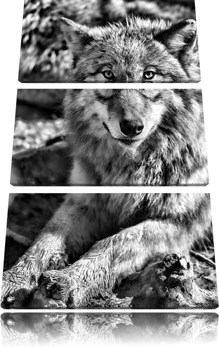 Pixxprint Monocrome, aufschauender Wolf 3-Teiler Leinwandbild 120x80 Bild auf Leinwand