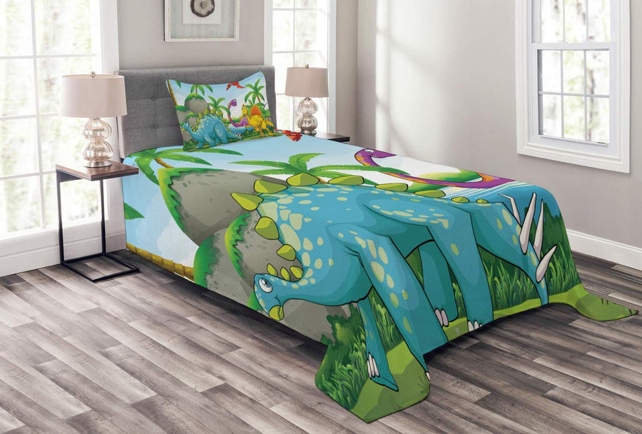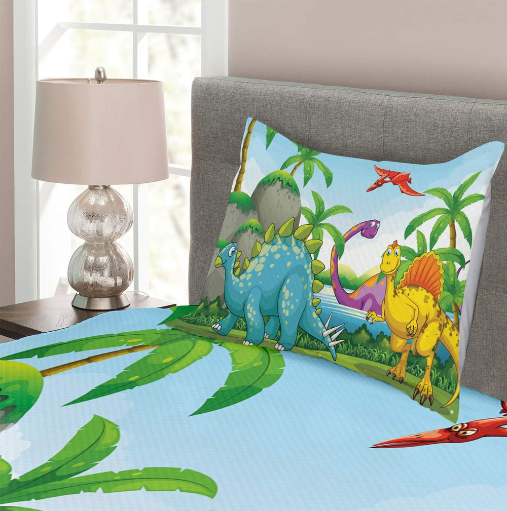 ABAKUHAUS Jurassic Tagesdecke Set, Dinosaurier im Dschungel, Set mit Kissenbezug luftdurchlässig, fü