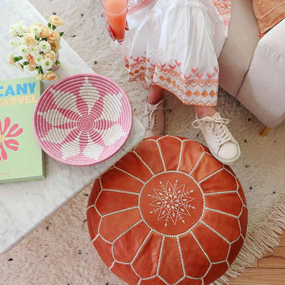 ALMADIH Leder Pouf Sitzkissen rosa mit lila Ziernaht Robustes Leder + formstabile Füllung - Traditio