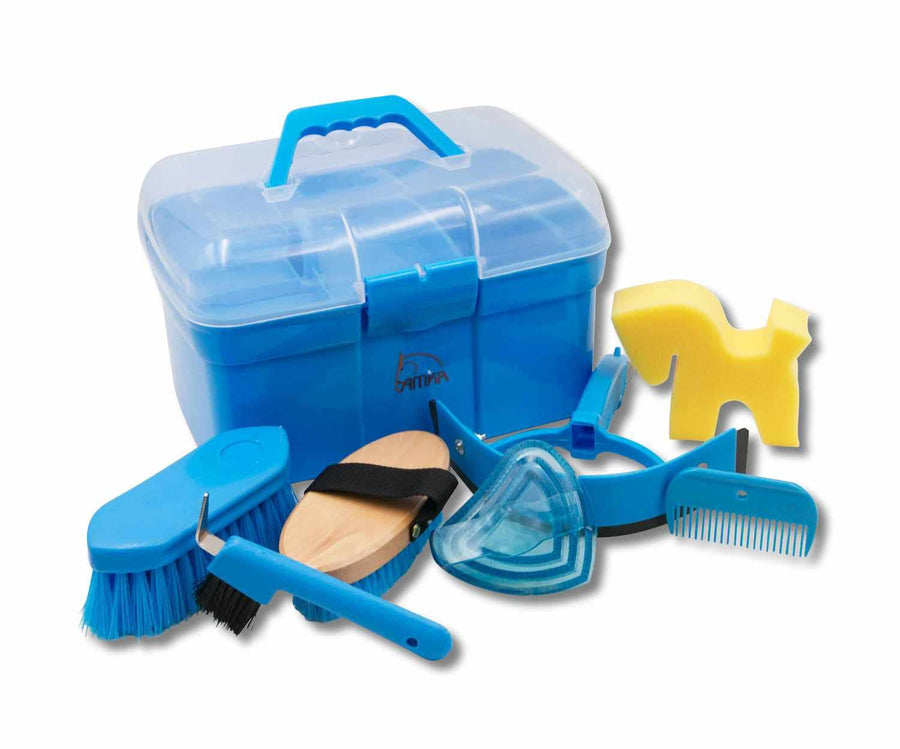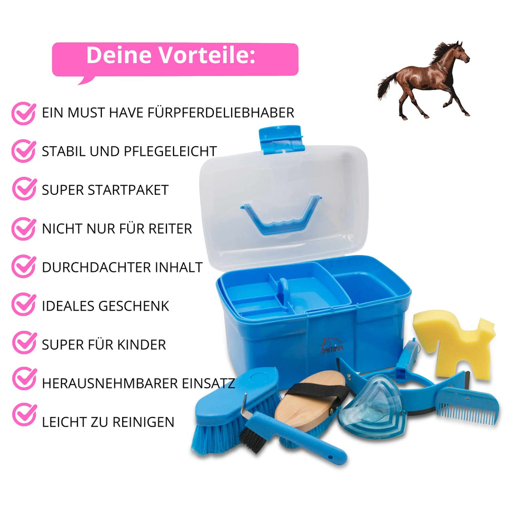 AMKA Pferde Putzbox Putzkasten Putzkoffer gefüllt für Kinder 7 teilig (azurblau), azurblau