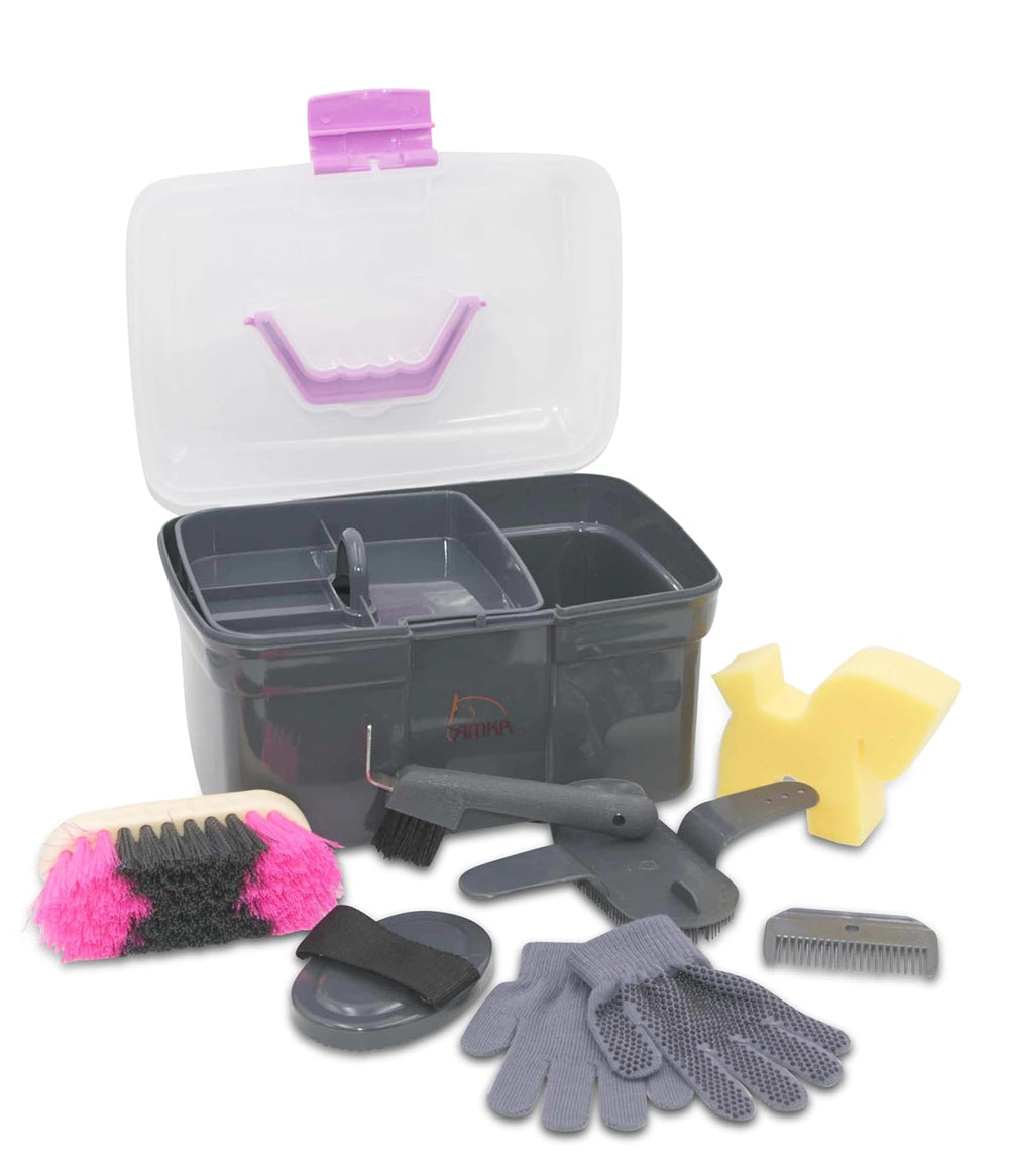 AMKA Putzbox gefüllt Putzkiste Putzzeug Pferdepflege Kinder 8teilig (grau), grau