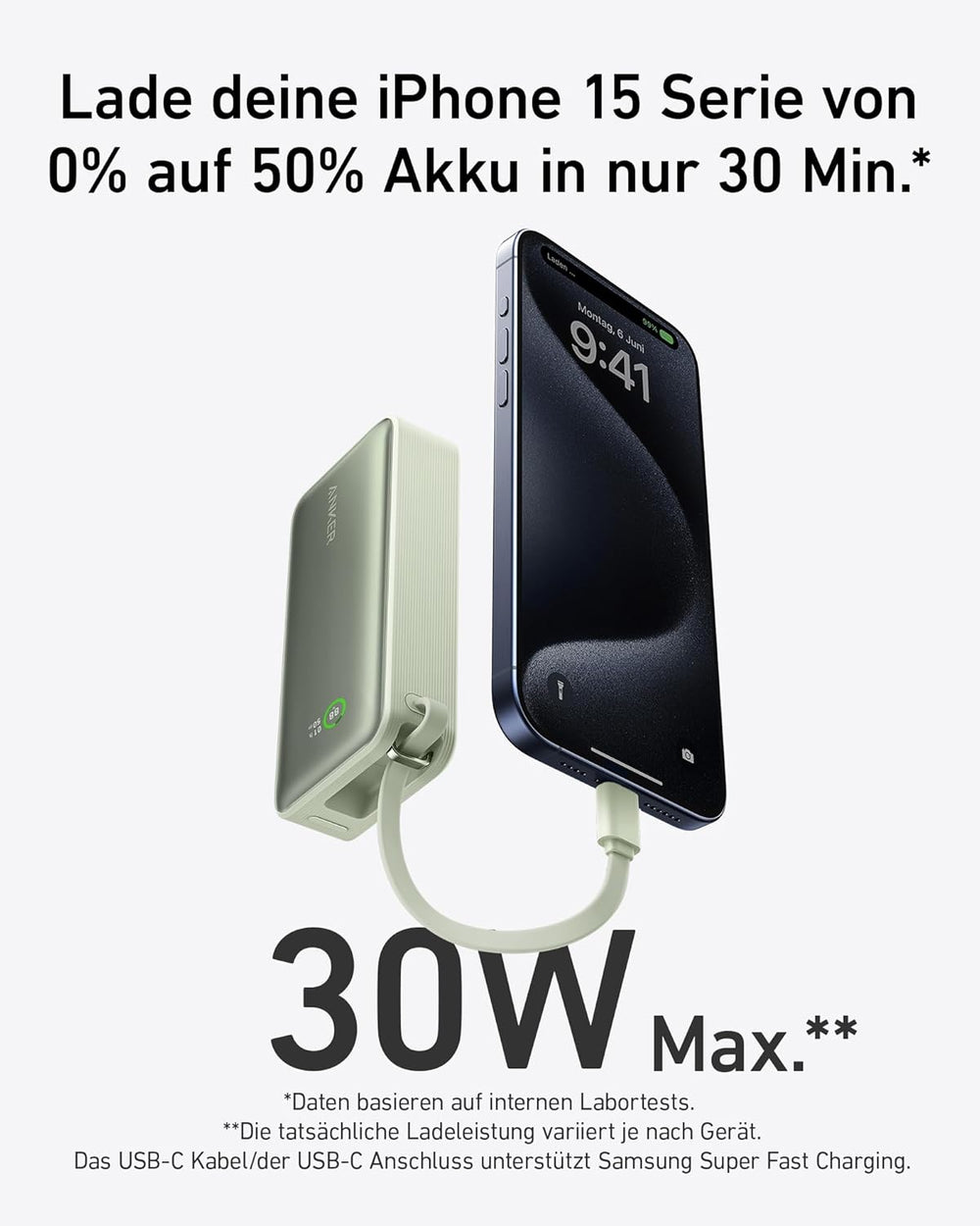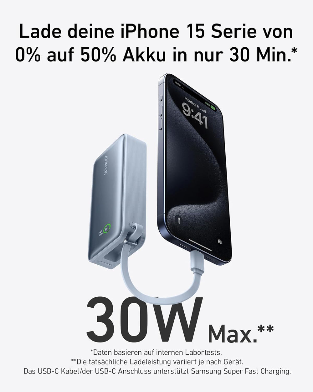 Anker Nano Powerbank,10.000mAh Powerbank mit eingebautem USB-C Kabel, PD 30W Höchstleistung mit 1x U