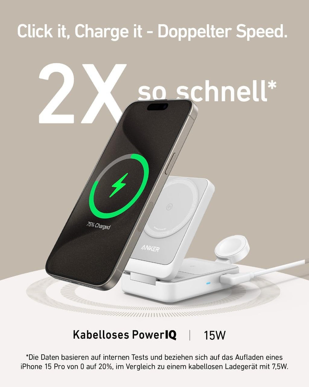 Anker MagGo 15W Magsafe Ladegerät kompatibel, 2-in-1 Induktive Ladestation, Qi2 Wireless Charger für