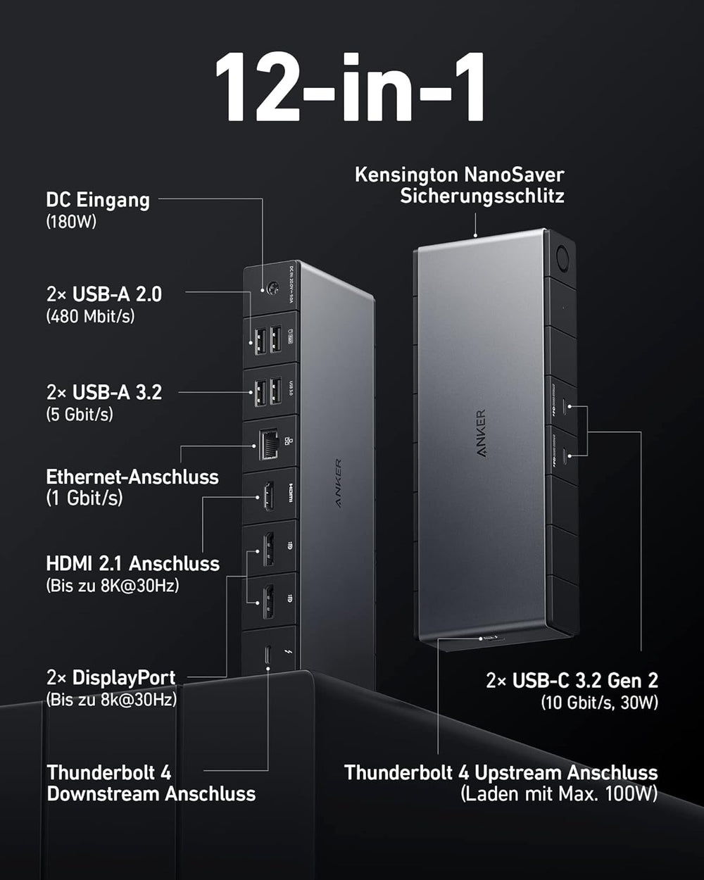 Anker 778 Thunderbolt Dockingstation (12-in-1, Thunderbolt 4), 40 Gbps mit Max 100W Aufladung für La