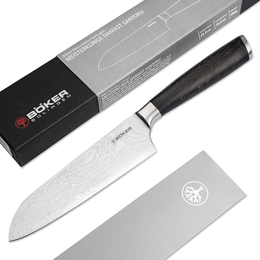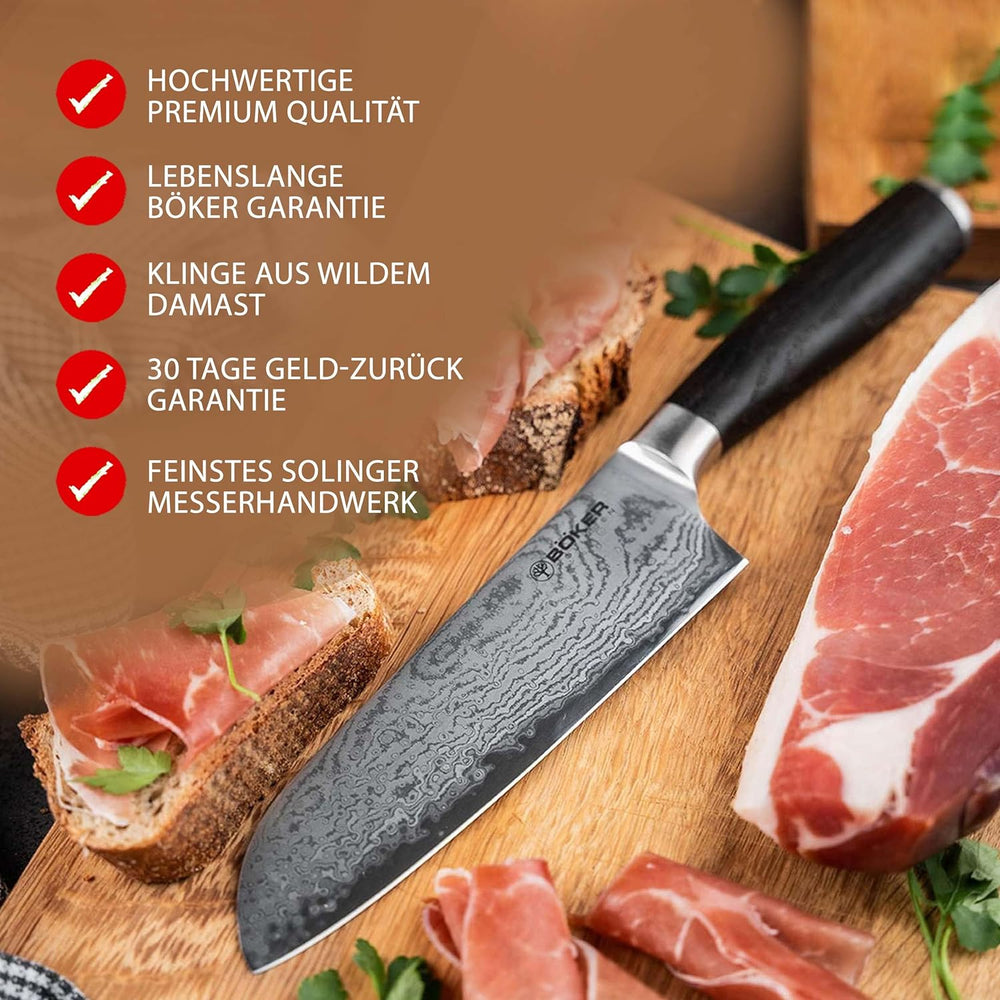 Böker SOLINGEN® Meisterklinge Damast Santoku - extrem scharfes Profi Kochmesser mit 16,5 cm Hybrid D
