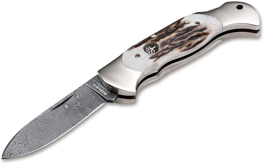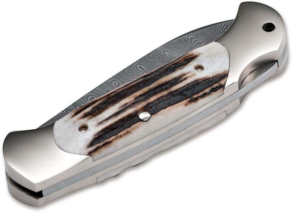Böker Manufaktur Solingen Unisex – Erwachsene Scout Spearpoint Hirschhorn Damast Taschenmesser, Silb
