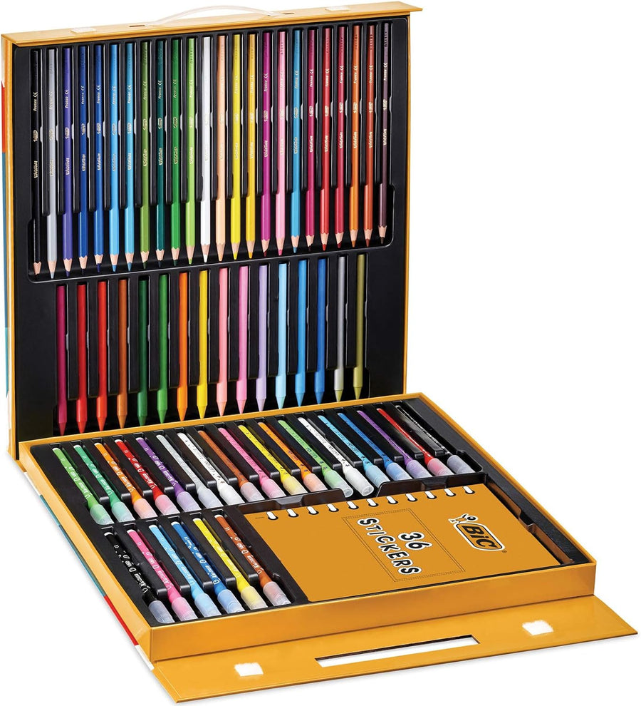 BIC Kids Stifte Set à 64: 24 Buntstifte, 24 Filzstifte, 16 Malkreiden und 36 Sticker, in praktischer