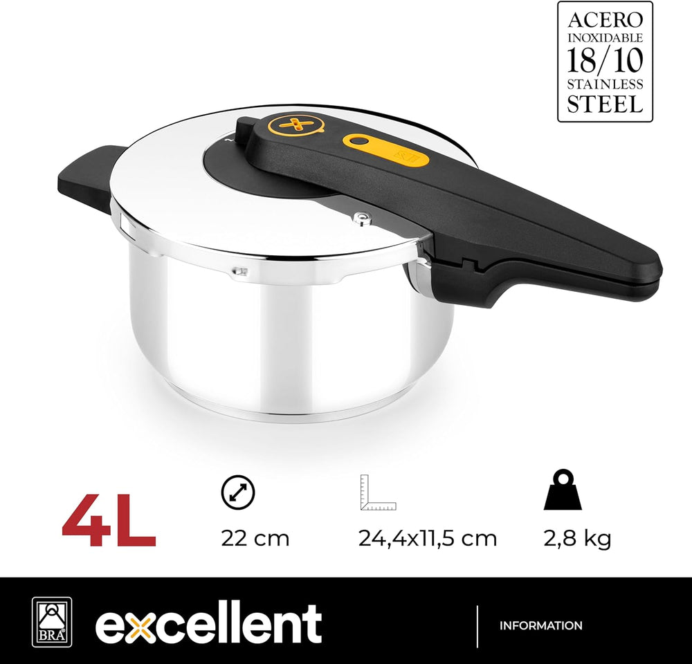 BRA Excellent | 4-Liter-Schnellkochtopf mit einfachem Öffnen, aus Edelstahl 18/10, mit 2 Kochprogram