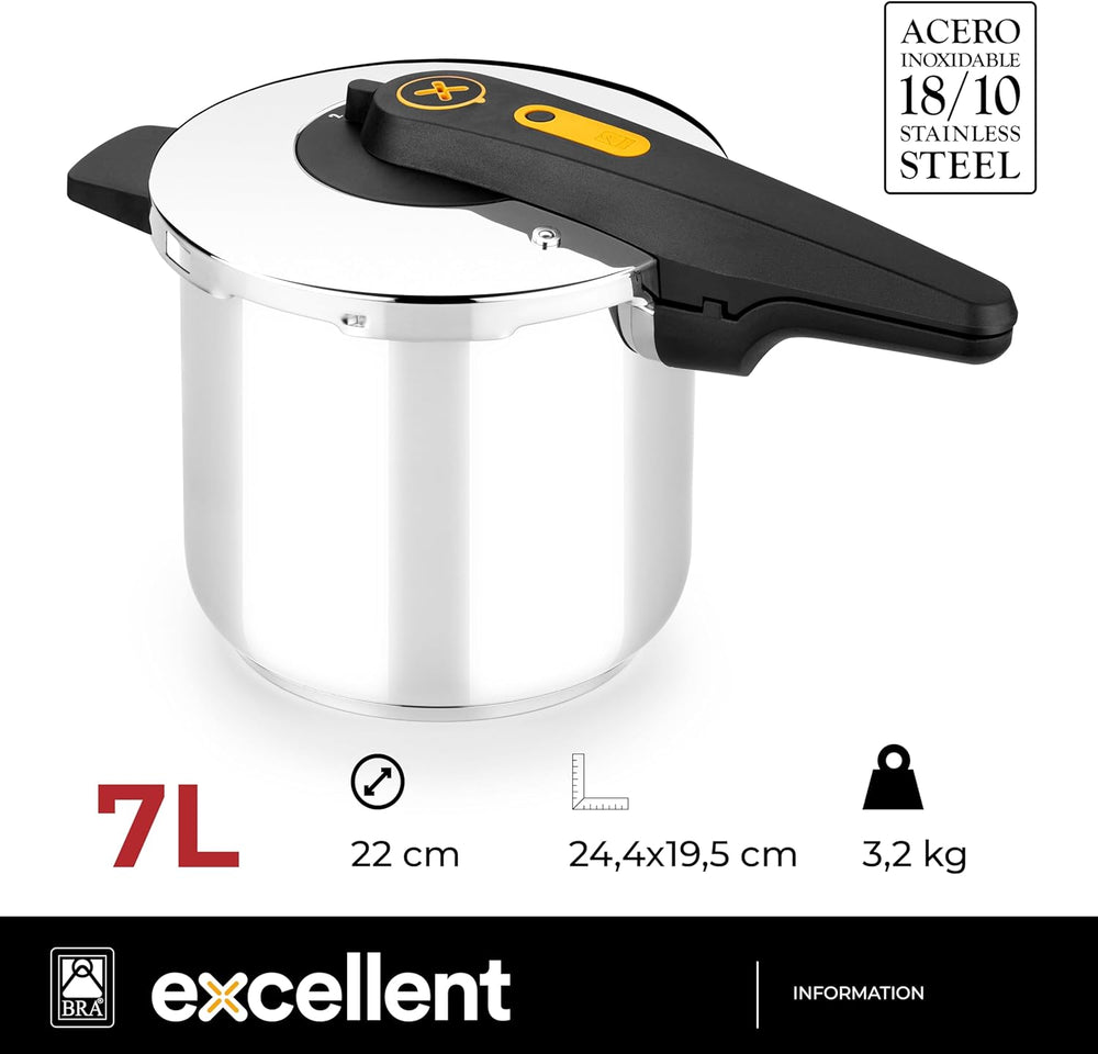 BRA Excellent - Schnellkochtopf mit leichter Öffnung, 7 Litern, hergestellt aus Edelstahl 18/10, mit