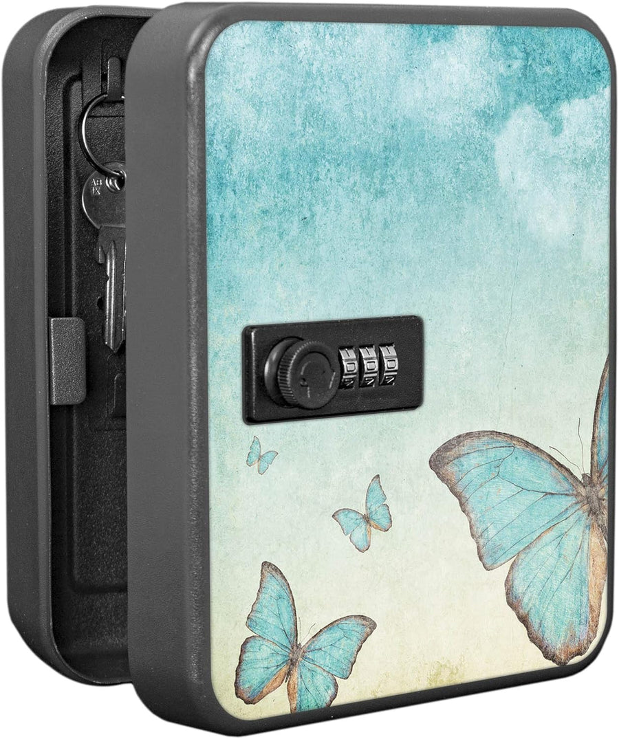 banjado® Burg-Wächter® abschliessbarer Schlüsselkasten mit Motiv Blaue Schmetterlinge für 20 Schlüss